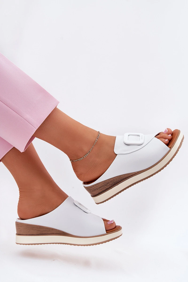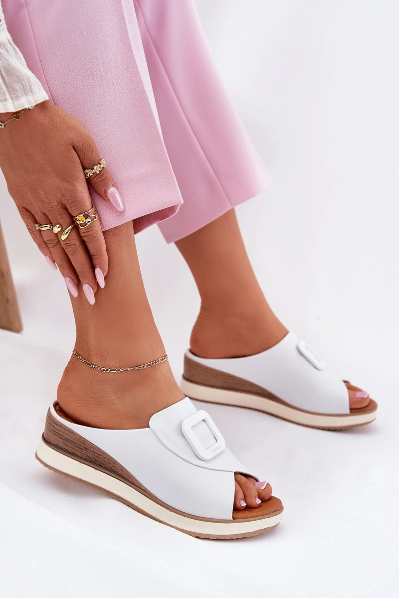 Dámské pantofle vyrobené z přírodní kůže jsou elegantním návrhem na teplejší dny. Upevněné na klínu, poskytují stabilitu a pohodlí po celý den. V přední části bot se nachází jemný ozdobný detail, který jim dodává výjimečný charakter. Měkká stélka se stará o pohodlí nošení a stylový střih zajišťuje, že pantofle budou dokonalým doplňkem letních stylizací. Při výběru velikosti se řiďte tabulkou velikostí.