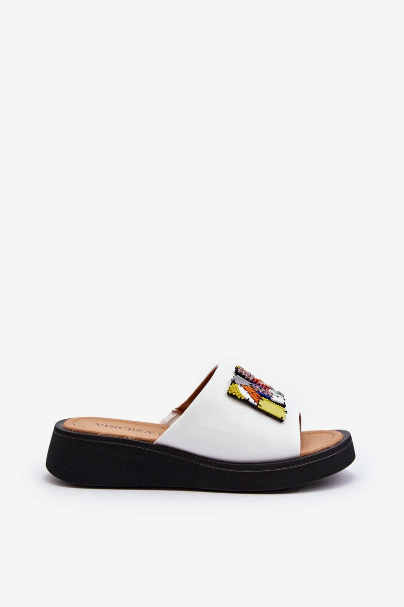Dámské klouzačky jsou vyrobeny z přírodní kůže. Tento model má ozdobu na čele. Klouzačky jsou umístěny na platformě a jemné klíně. Měkounká vložka vyrobena z přírodní kůže umožní pohodlné nošení obuvi. Tyto klouzačky s zajímavým střihem se jistě osvěží v mnoha stylových kombinacích! Určitě si je musíte mít ve své letní garderobě! Při výběru velikosti se řiďte tabulkou velikostí.