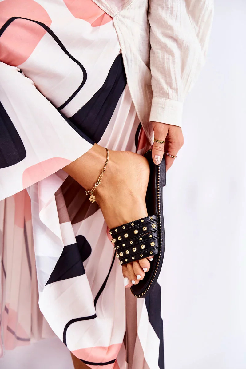 Jedinečné dámské pantofle s módními ozdobnými cvočky. Vyrobeno z eko kůže. Měkká stélka Comfort Shoes z eko kůže je velmi pohodlná na používání. Pantofle mají kolem podrážky jemný ornament. Nos je otevřený, zaoblený. Nasazené na plochém podpatku, s podrážkou z plastu. Solidní model, ideální na letní dny! Při výběru velikosti použijte tabulku velikostí.