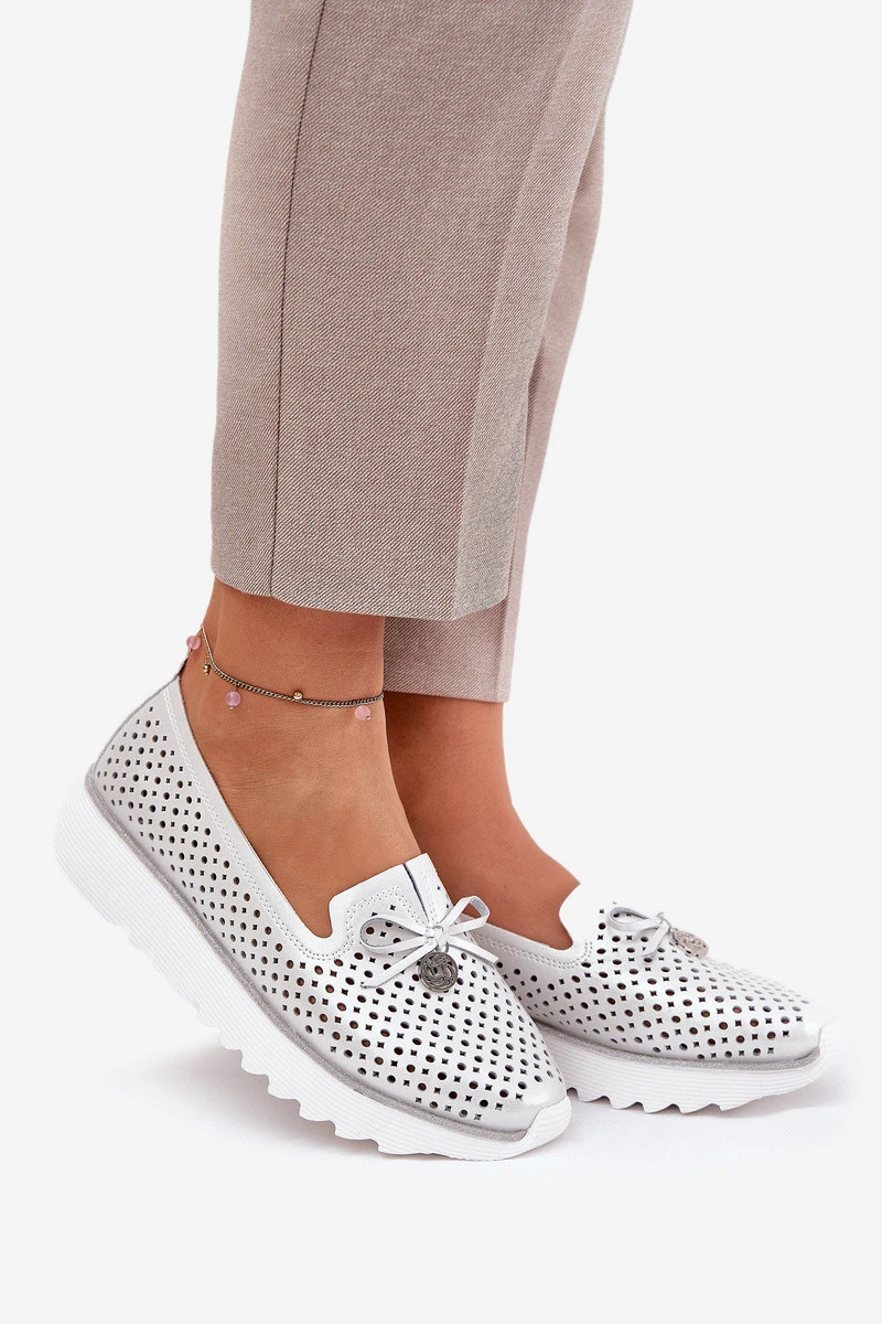 Elegantní, perforované dámské polobotky vyrobené z přírodní kůže, umístěné na platformě, které spojují komfort s jemným stylem. Zaoblené špičky zajišťují pohodlí a na přední části bot se nachází mašlička a jemný detail, který jim dodává kouzlo. Kožená, měkká stélka zaručuje pohodlí po celý den. Tyto polobotky budou ideální volbou na každodenní nošení, spojující eleganci s funkčností a hodící se k mnoha stylizacím. Při výběru velikosti se řiďte tabulkou velikostí.