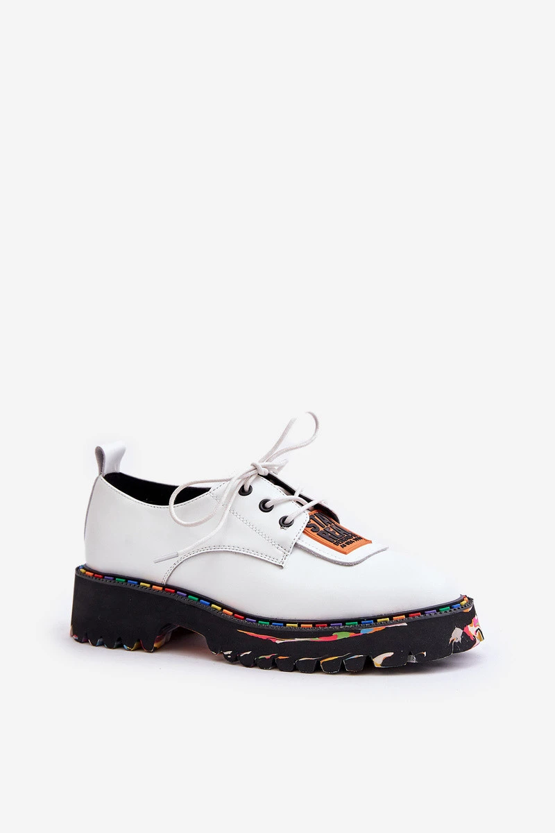 Dámské polobotky vyrobené z přírodní kůže, které spojují eleganci a pohodlí. Usazené na platformě a plochém podpatku, zajišťují komfort nošení po celý den. Zaoblené špičky jim dodávají klasický vzhled a šněrování umožňuje dokonalé přizpůsobení k noze. Na jazyku je ozdobný nápis. Ideální na různé příležitosti, skvěle se hodí do každodenních stylizací. Při výběru velikosti se řiďte tabulkou velikostí.