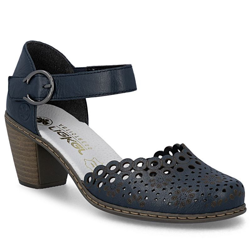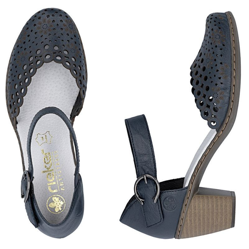 Dámské kožené sandály na jehlovém podpatku pohodlné ažurové tmavě modré Rieker 40902-14