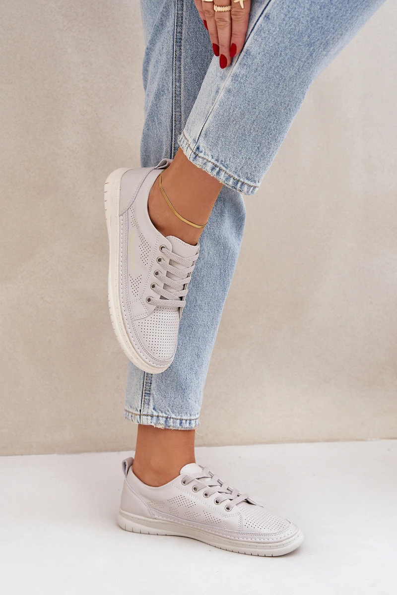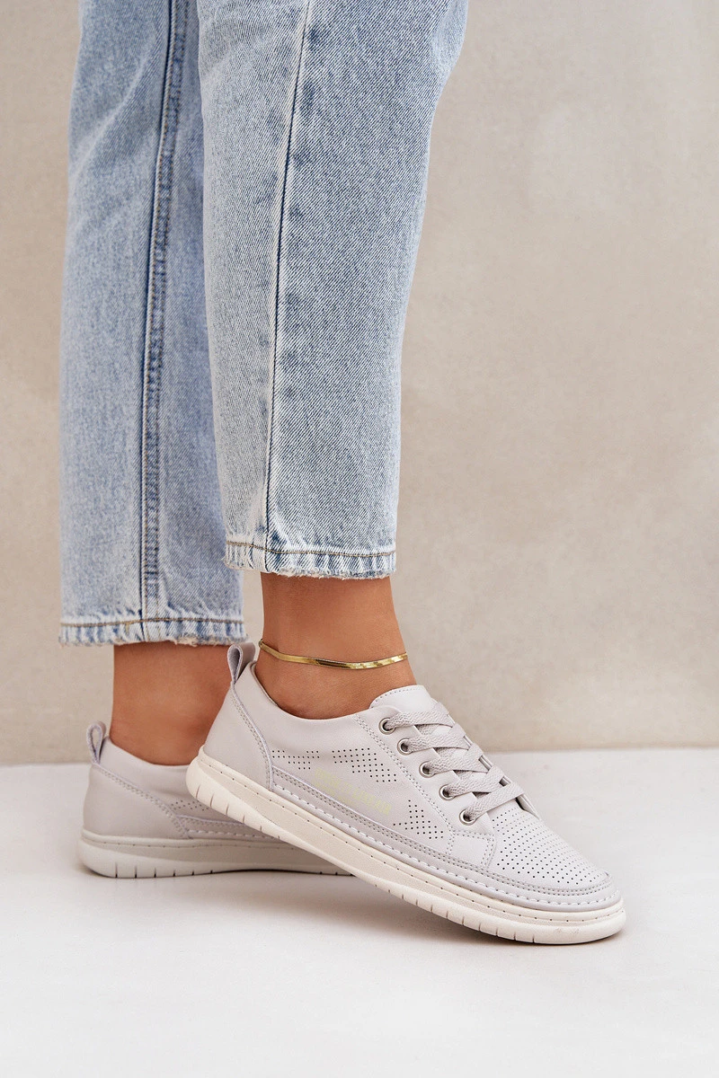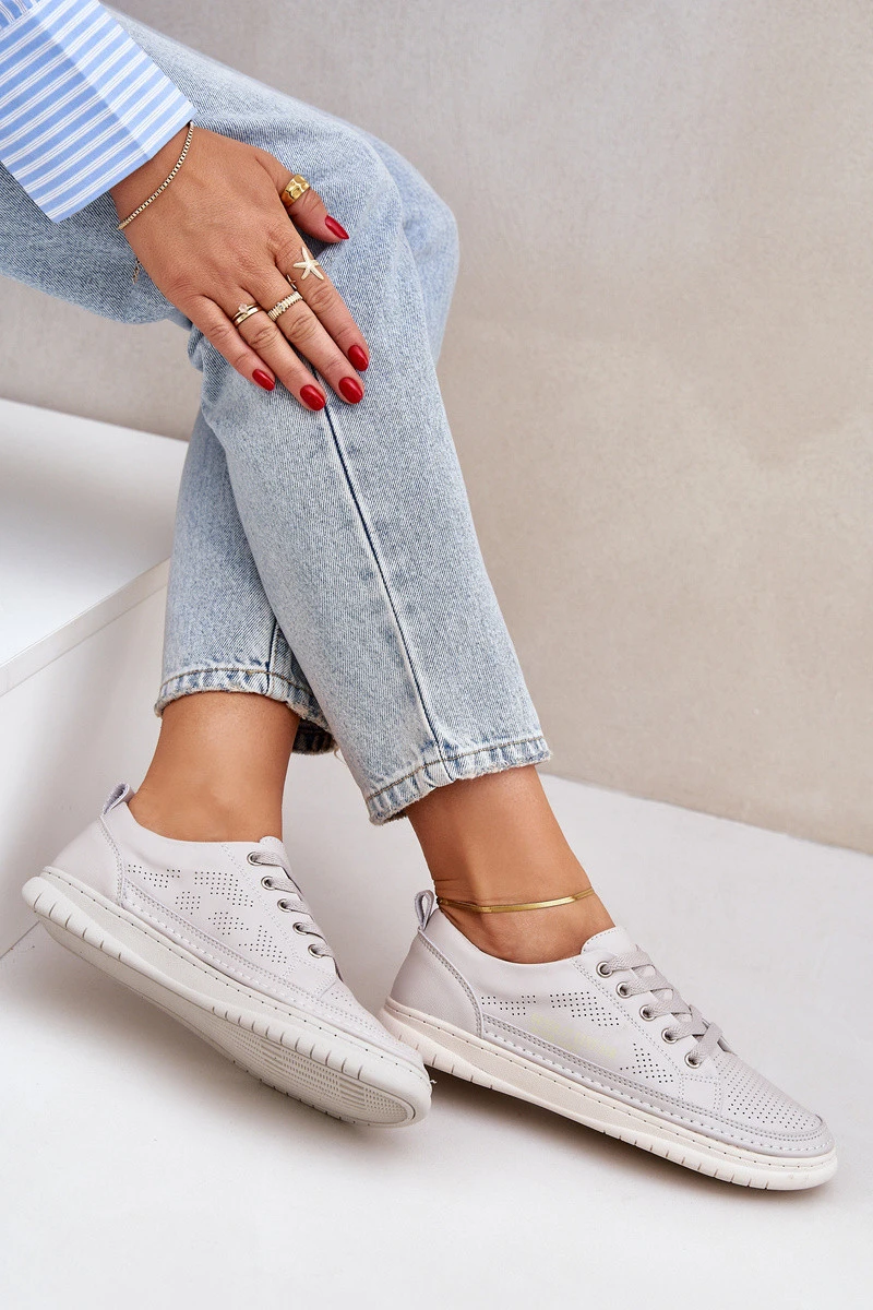 Tenisky na podrážce z pryžového materiálu v klasickém střihu. S nízkým svrškem před kotník. Model uvázaný na kulaté tkaničky. Vyrobené z přírodní, měkké kůže s perforací, což zajišťuje, že jsou mimořádně prodyšné a pohodlné při nošení. Pohodlná stélka je také vyrobena z přírodní kůže. Skvěle se hodí k běžným stylizacím, zejména k džínům nebo kraťasům. Lehké a stylové - měla byste je mít ve své skříni! Při výběru velikosti se řiďte tabulkou velikostí.