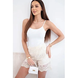 Stylové dámské šortky s krajkovým zakončením jsou ideální volbou pro ženy, které si cení módního vzhledu a pohodlí v letních outfitech. Model se vyznačuje efektním ažurovým vzorem, který dodává celku lehkost a jemně ženský charakter. Kontrastní podšívka krásně zvýrazňuje strukturu krajky a vytváří jedinečný vizuální efekt.