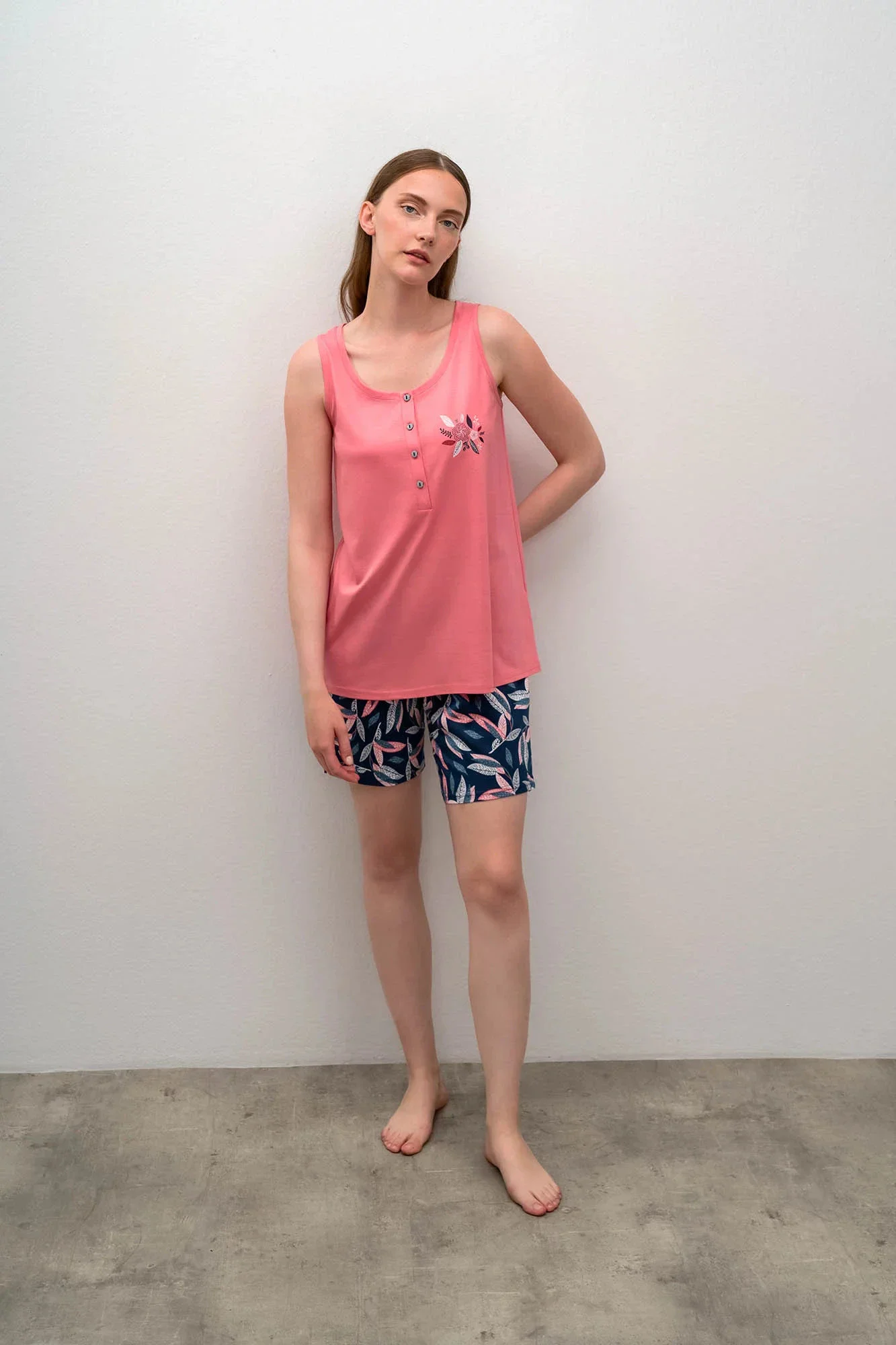 Dámské krátké pyžamo, vrchní díl jednobarevný s potiskem na hrudi, u krku na knoflíky, spodní díl barevný - listy