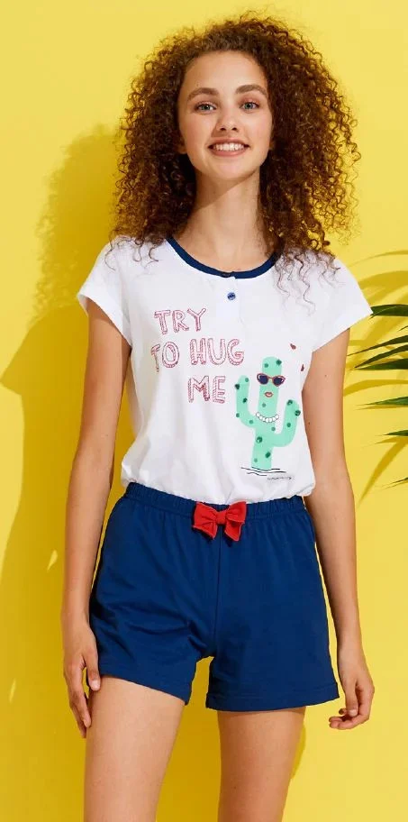 Dámské krátké pyžamo FA6712PB - Noidinotte. Hravé dámské pyžamo s krátkým rukávem a kraťasy. Tričko je zdobeno třpytivým popiskem a kaktusem s bambulkami. Na kraťasech ozdobná mašlička.