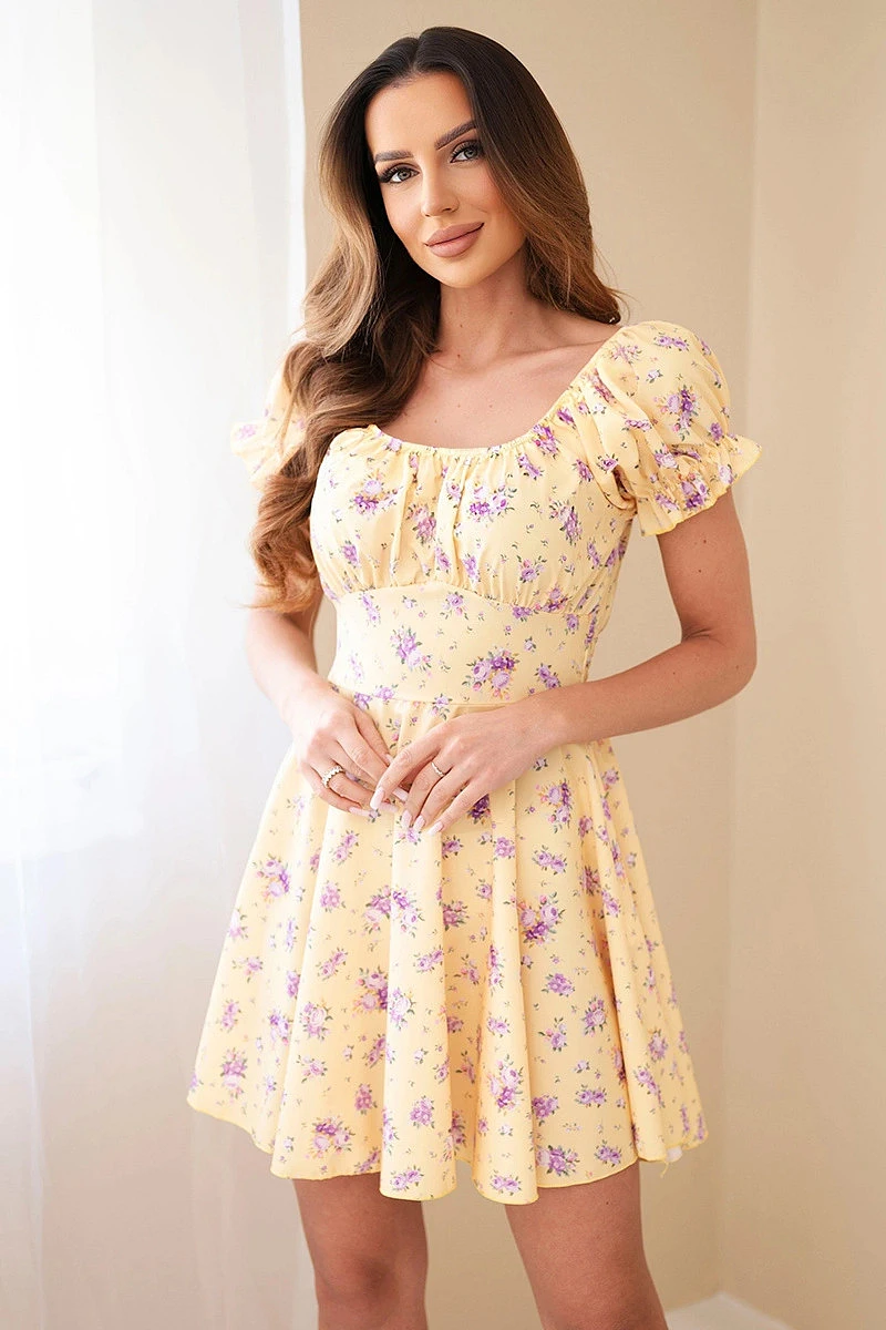 Dámské květinové šaty s balónovým rukávem a elastickým pasem žluté