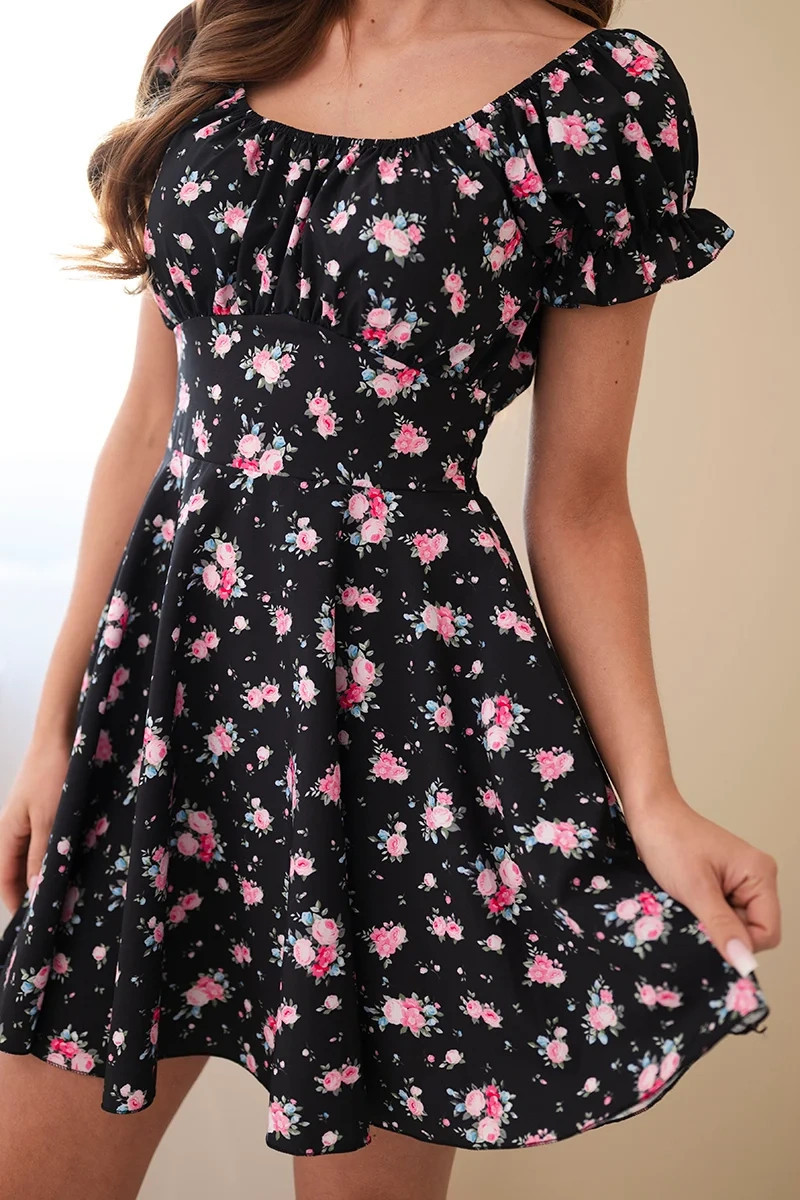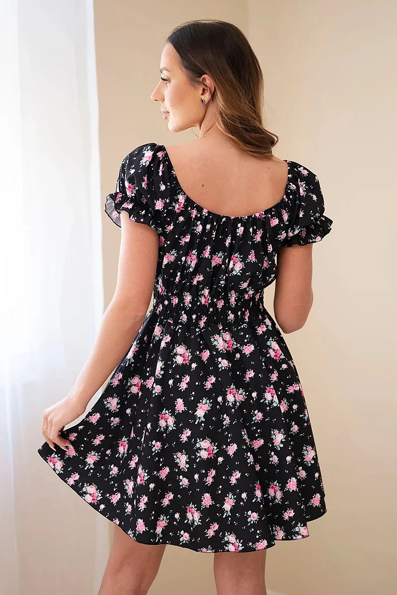 Dámské květinové šaty s nabíraným rukávem a elastickým pasem černá