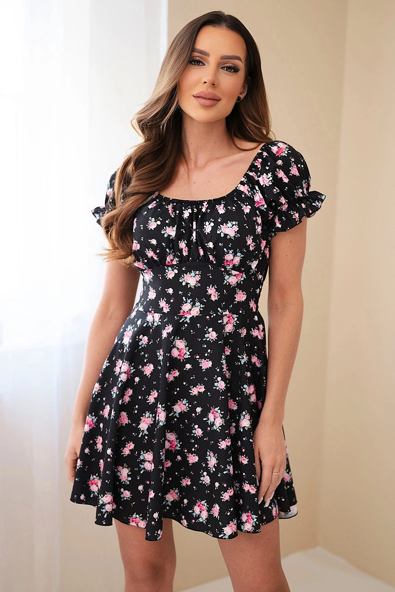 Dámské květinové šaty s nabíraným rukávem a elastickým pasem černá