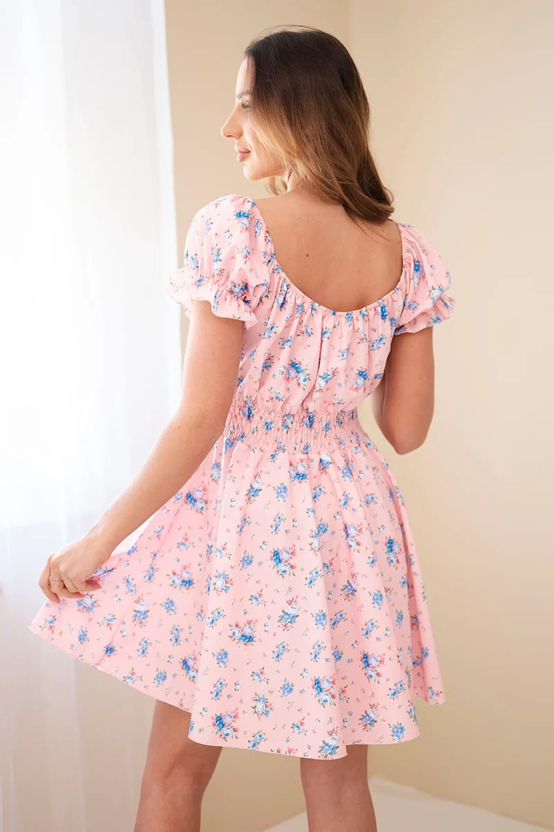 Dámské květinové šaty s nabíraným rukávem a elastickým pasem pudrově růžová