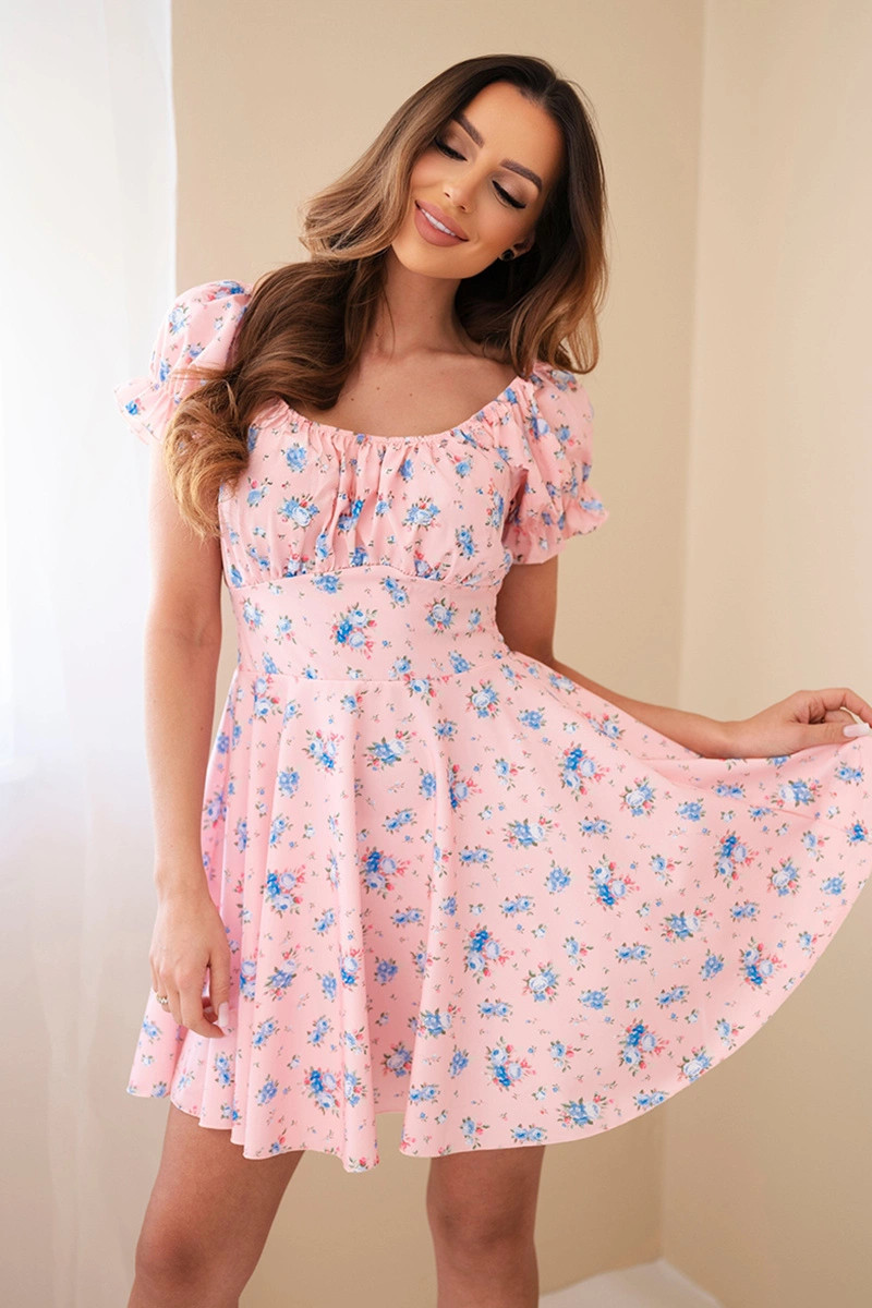 Dámské květinové šaty s nabíraným rukávem a elastickým pasem pudrově růžová