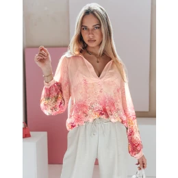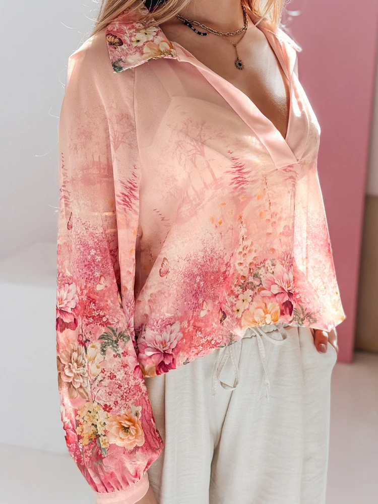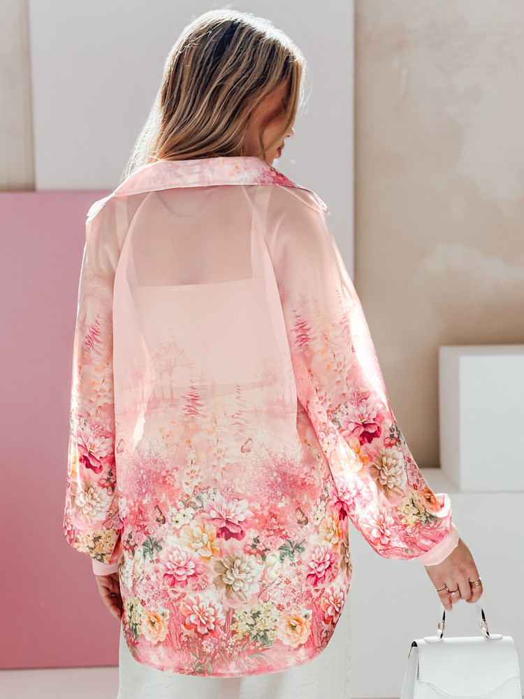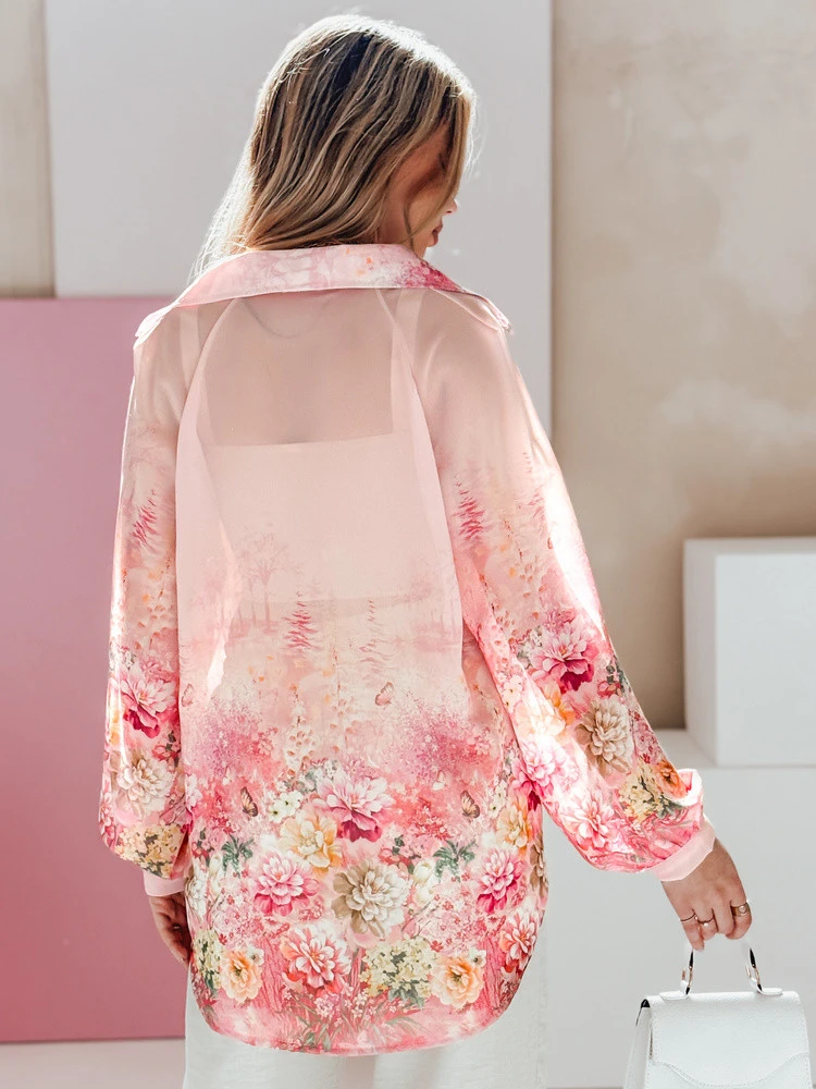 Lehká a vzdušná dámská košile oversize s jedinečným květinovým potiskem, který upoutá pozornost. Univerzální velikost padne od XS do L. Vyrobena z tenkého poloprůhledného materiálu, který jemně obepíná siluetu. Delší zadní díl decentně prodlužuje siluetu. Model v jedné velikosti s hlubokým výstřihem do V, dlouhými rukávy s manžetami na knoflíky, vhodný pro každodenní i formální outfit.