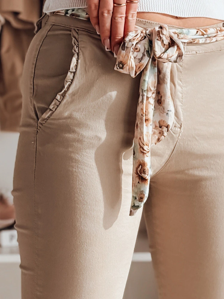 Dámské látkové kalhoty v klasickém střihu, který se hodí k mnoha příležitostem. Středně vysoký pas a pásek na zavázání s květinami jim dodávají jedinečný charakter. Zapínají se na knoflík a zip, dokonale se přizpůsobí siluetě. Pohodlné a stylové, ideální pro každou denní dobu.....