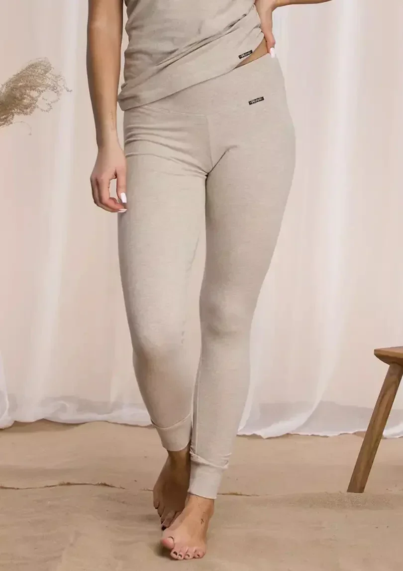 Pohodlné, vypasované legíny s úzkým elastickým pasem. Melanžové, hřejivé spodní prádlo z přírodních bavlněných vláken