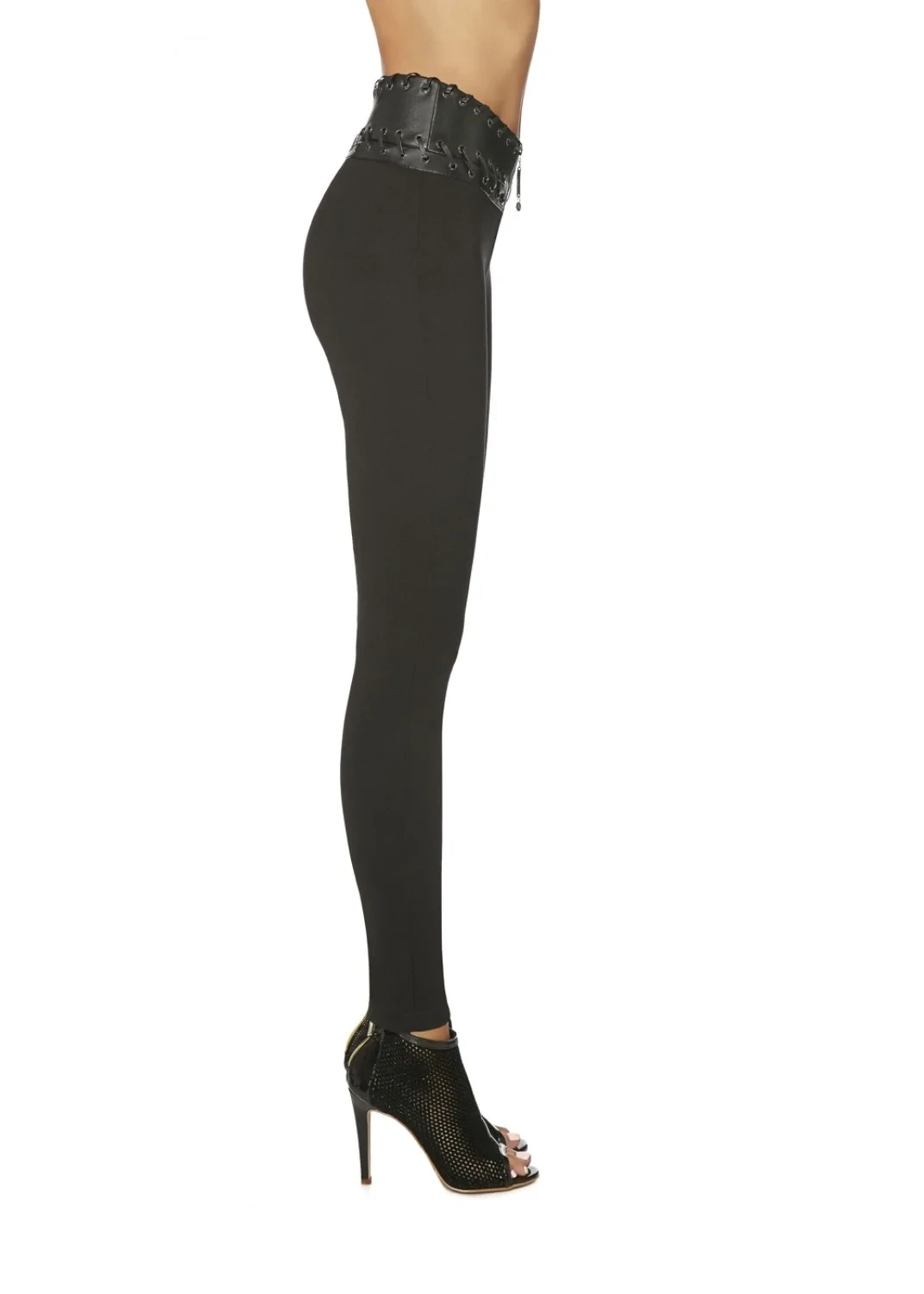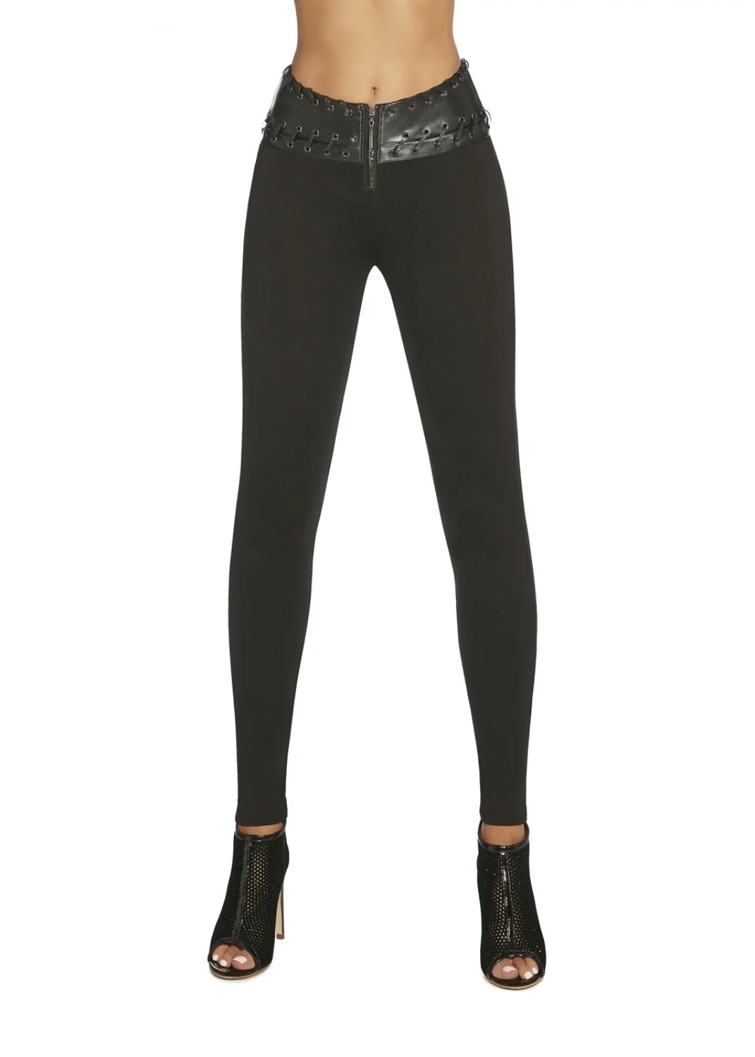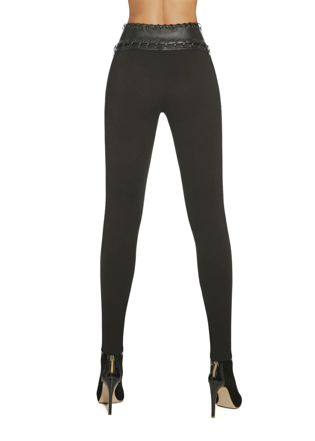 Dámské legíny s originálně řešeným pasem Simini Bas Bleu - jsou z příjemné viskózy a elastanu - pas je širší, potažený imitací kůže s očky, kterými jsou protažené tenké kožené pásky - vepředu je zapínání na zip - push-Up efekt navíc krásně vytvaruje zadeček - běžná délka ke kotníkům (dle výšky postavy) - jemnost: 200 DEN