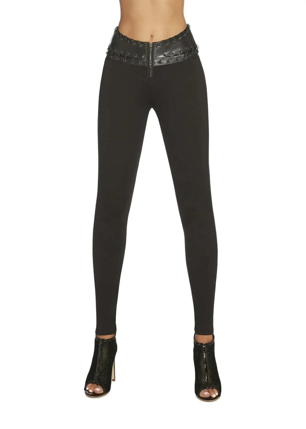 Dámské legíny s originálně řešeným pasem Simini Bas Bleu - jsou z příjemné viskózy a elastanu - pas je širší, potažený imitací kůže s očky, kterými jsou protažené tenké kožené pásky - vepředu je zapínání na zip - push-Up efekt navíc krásně vytvaruje zadeček - běžná délka ke kotníkům (dle výšky postavy) - jemnost: 200 DENMateriálové složení: 62% viskóza + 28% polyester + 10% elastan