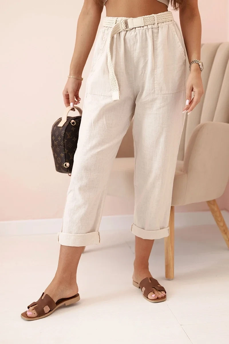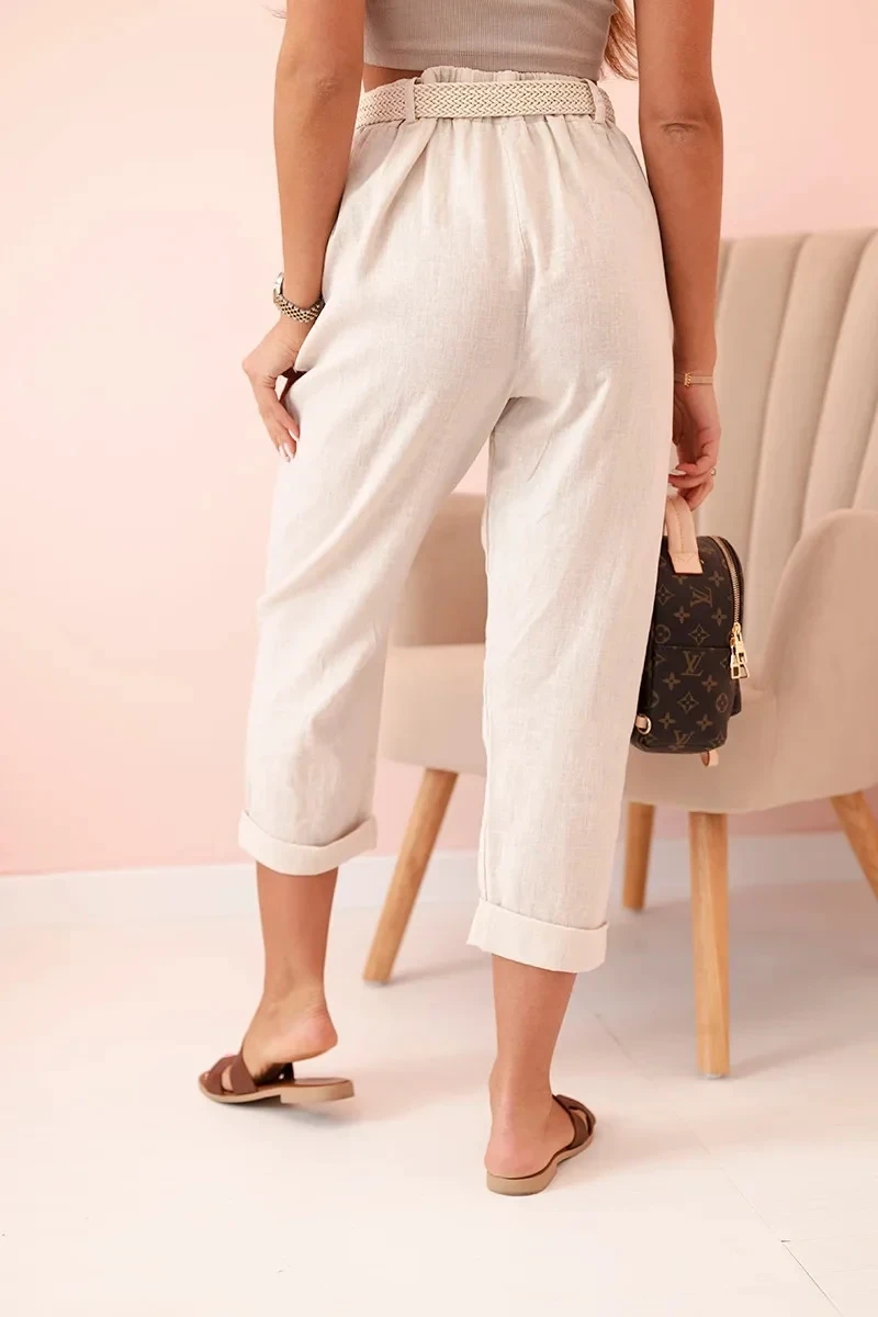 Dámské lněné kalhoty s bavlnou a páskem béžové