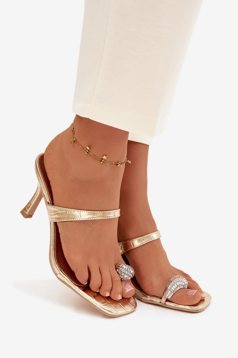 Elegantní dámské sandály z eko kůže jsou výjimečnou volbou pro ženy, které ocení styl a ženský vzhled. Tenký podpatek typu jehlový podtrhuje siluetu, dodává lehkost a eleganci. Pásek na nártu zajišťuje stabilitu a ozdobný, šperkový detail na prstu přitahuje pozornost a dodává celku luxusní charakter. Tento model je ideální na večerní výlety, oslavy a speciální příležitosti. Při výběru velikosti se řiďte tabulkou velikostí.