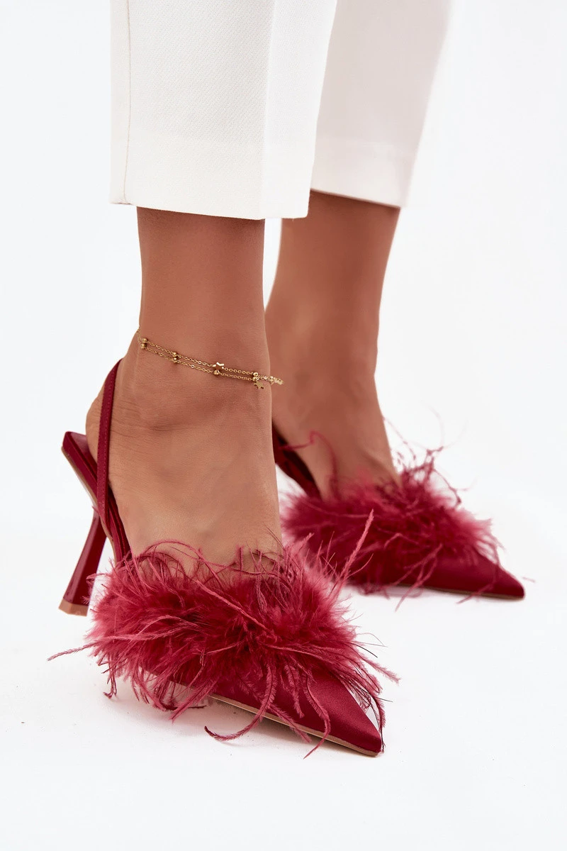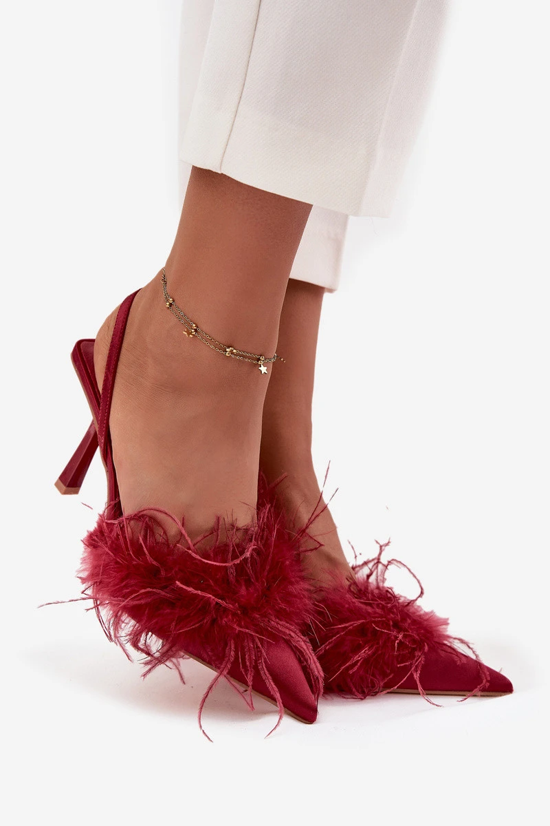 Elegantní dámské lodičky Belice v bordó odstínu kombinují jemný glamour styl s moderním designem. Peří a otevřená pata dodávají botám výrazný a sofistikovaný vzhled vhodný na večerní akce.