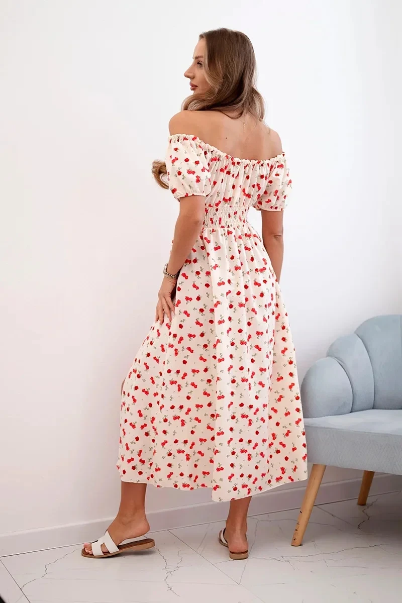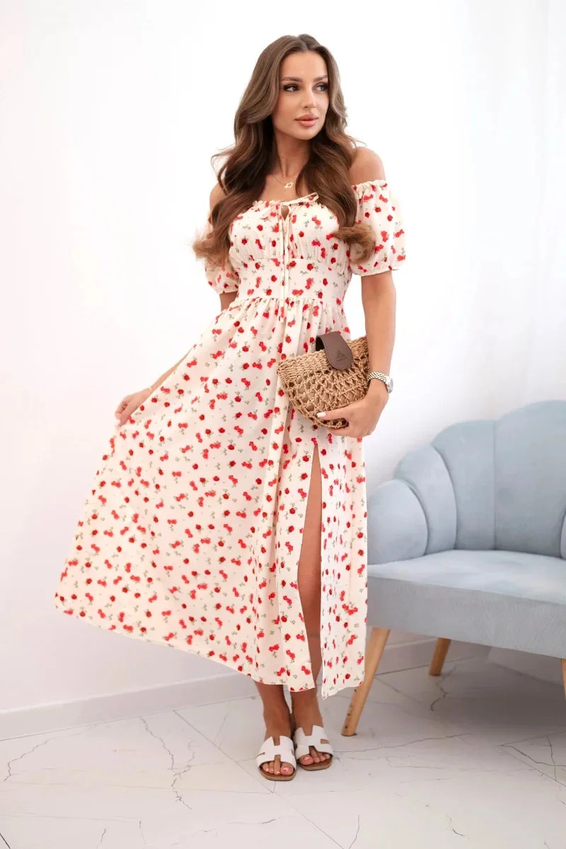 Španělský výstřih s jemným zavazováním zvýrazňuje ženskost a dodává šatům šarm, zatímco krátké nadýchané rukávy přidávají jemnost. Přiléhavý pas krásně zvýrazňuje siluetu a rozšířená sukně dodává lehkost a volnost pohybu. Ideální volba pro ženy, které oceňují styl a pohodlí.