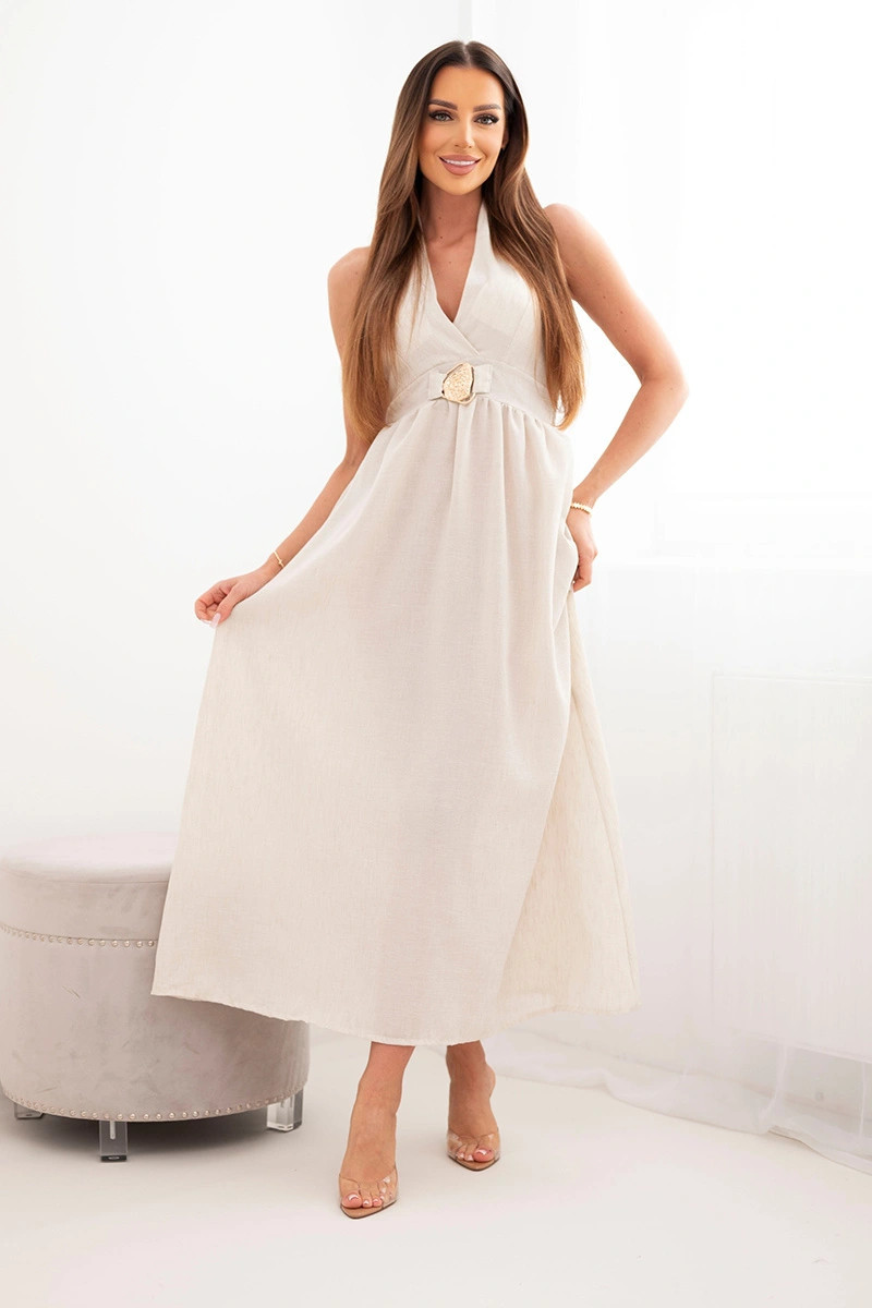 Dámské maxi šaty z viskózy vázané u krku s ozdobnou sponou béžová