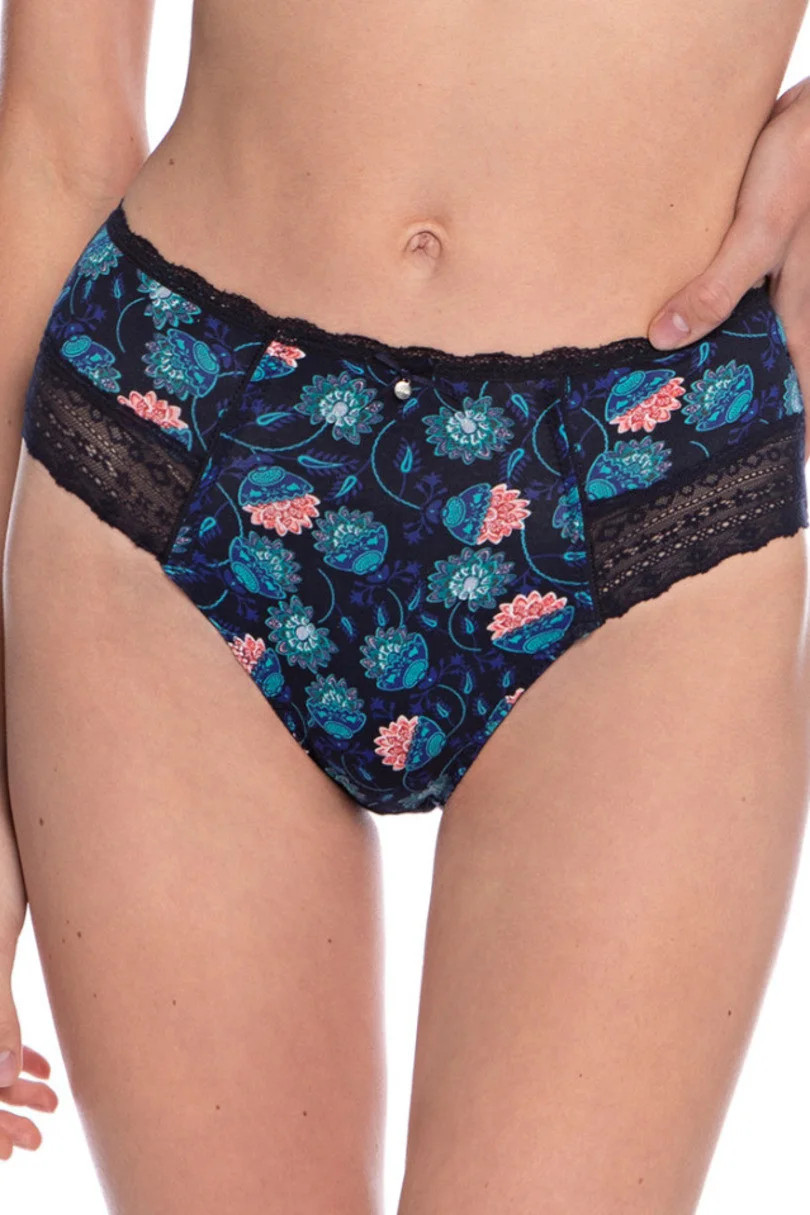 Dámské kalhotky z bavlny. Vysoký pas, zvýšené boky, krajkové lemování.