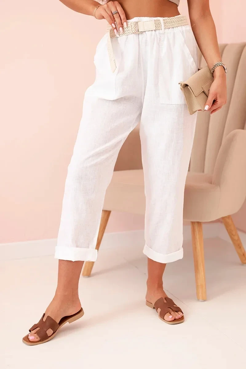 Dámské model 21219995 kalhoty s bavlnou a páskem bílé - K-Fashion