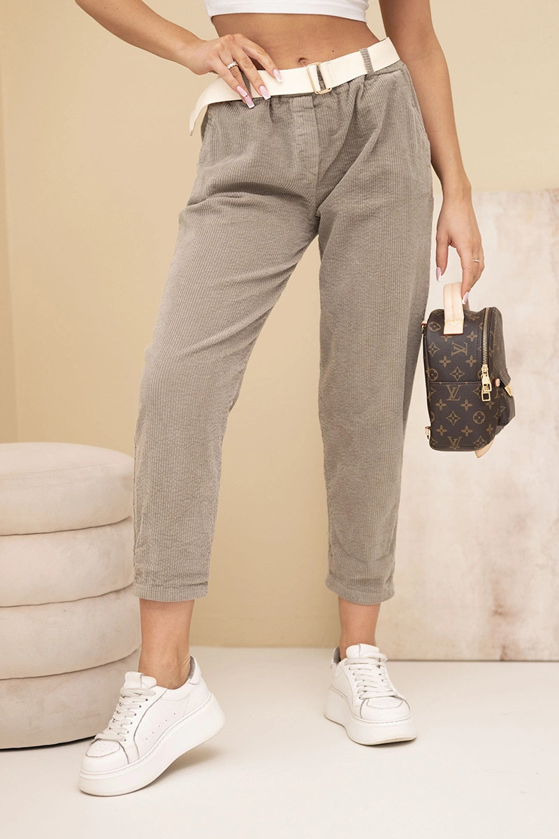 Pohodlné a módní dámské kalhoty z měkkého manšestru jsou skvělou volbou na chladnější dny. Jejich moderní střih se zúženými nohavicemi a elastickým pasem zajišťuje dokonalé přizpůsobení postavě a vysoký komfort nošení. Součástí soupravy je látkový pásek, který zvýrazňuje pas a dodává stylové zakončení celé stylizaci.
