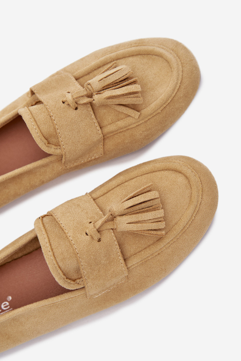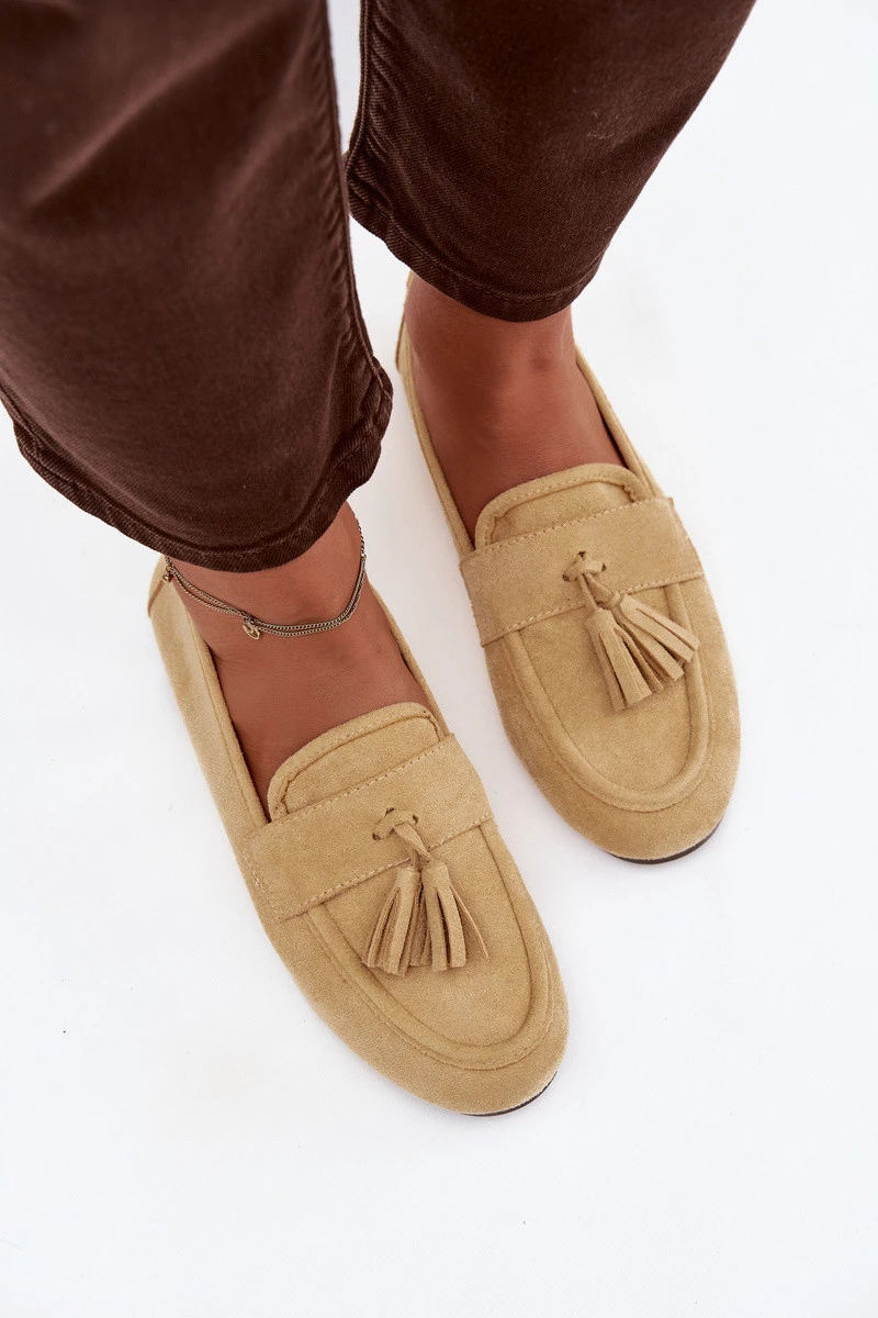 Ploché dámské mokasíny vyrobené z eko semiše jsou stylovou a pohodlnou volbou na každý den. Vepředu jsou dekorativní třásně a zavázání ve tvaru mašle. Měkký materiál zajišťuje pohodlí při nošení a plochá podrážka činí tento model ideálním pro každodenní použití. Mokasíny skvěle doplní jak klasické, tak i volnější stylizace. Při výběru velikosti se řiďte tabulkou velikostí.
