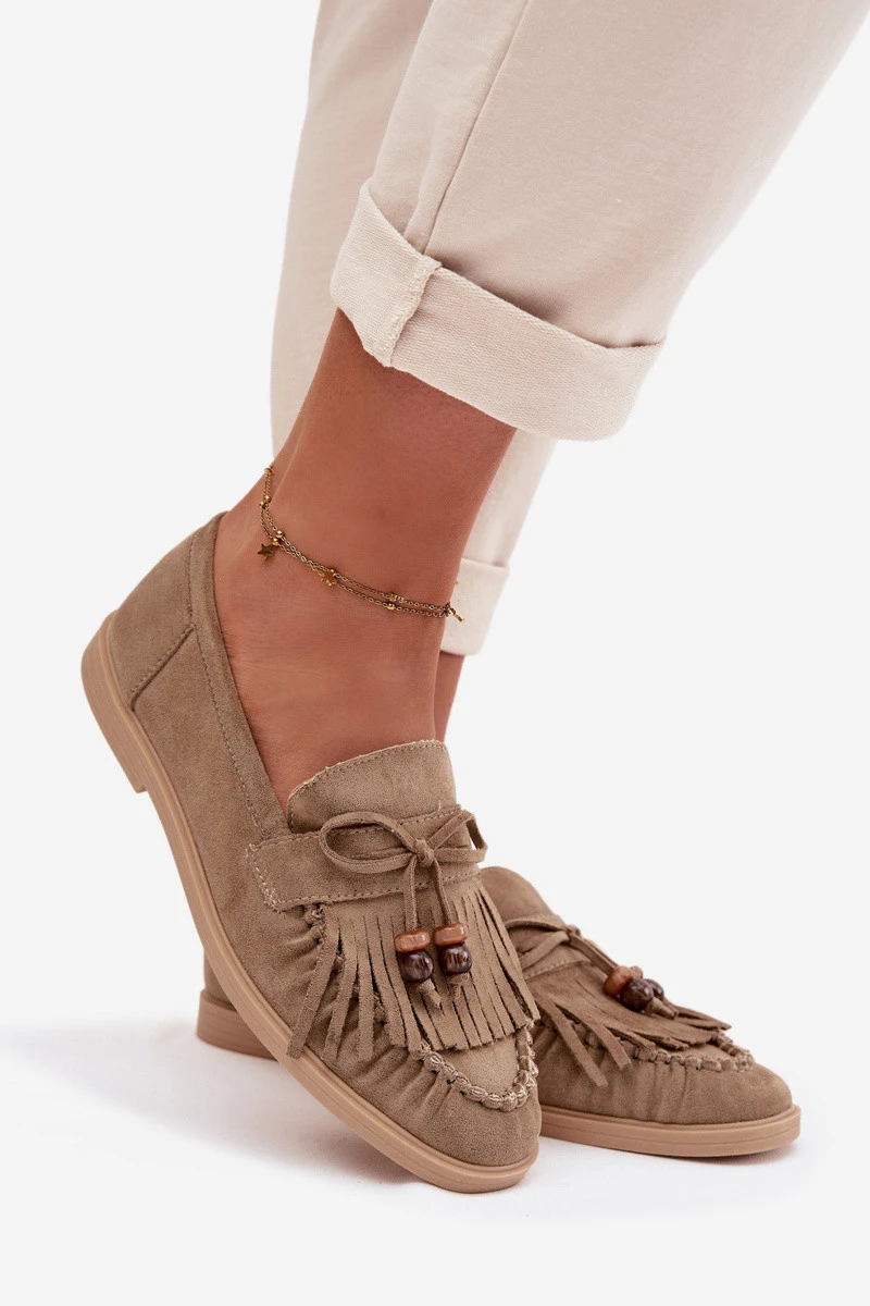 Dámské mokasíny z eko semiše jsou stylovým návrhem na každodenní nošení. Přední část boty zdobí dekorativní třásně a zavazování ve tvaru mašle s korálky, které dodávají celku jemný, ženský charakter. Měkký materiál zajišťuje pohodlí při nošení a klasický střih činí mokasíny ideální jak pro volný čas, tak pro elegantnější stylizace. Při výběru velikosti se řiďte tabulkou velikostí.