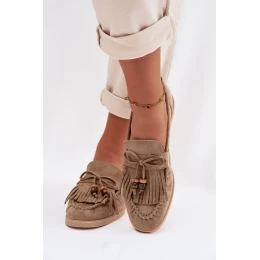 Dámské mokasíny z eko semiše jsou stylovým návrhem na každodenní nošení. Přední část boty zdobí dekorativní třásně a zavazování ve tvaru mašle s korálky, které dodávají celku jemný, ženský charakter. Měkký materiál zajišťuje pohodlí při nošení a klasický střih činí mokasíny ideální jak pro volný čas, tak pro elegantnější stylizace. Při výběru velikosti se řiďte tabulkou velikostí.