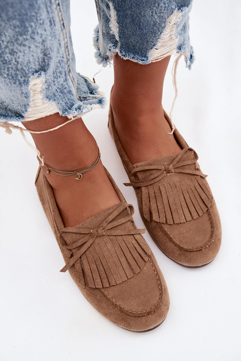 Ploché dámské mokasíny vyrobené z eko semiše jsou stylovou a pohodlnou volbou na každý den. Vepředu jsou dekorativní třásně a zavázání ve tvaru mašle. Měkký materiál zajišťuje pohodlí při nošení a plochá podrážka činí tento model ideálním pro každodenní použití. Mokasíny skvěle doplní jak klasické, tak i volnější stylizace. Při výběru velikosti se řiďte tabulkou velikostí.