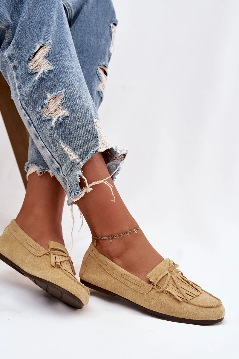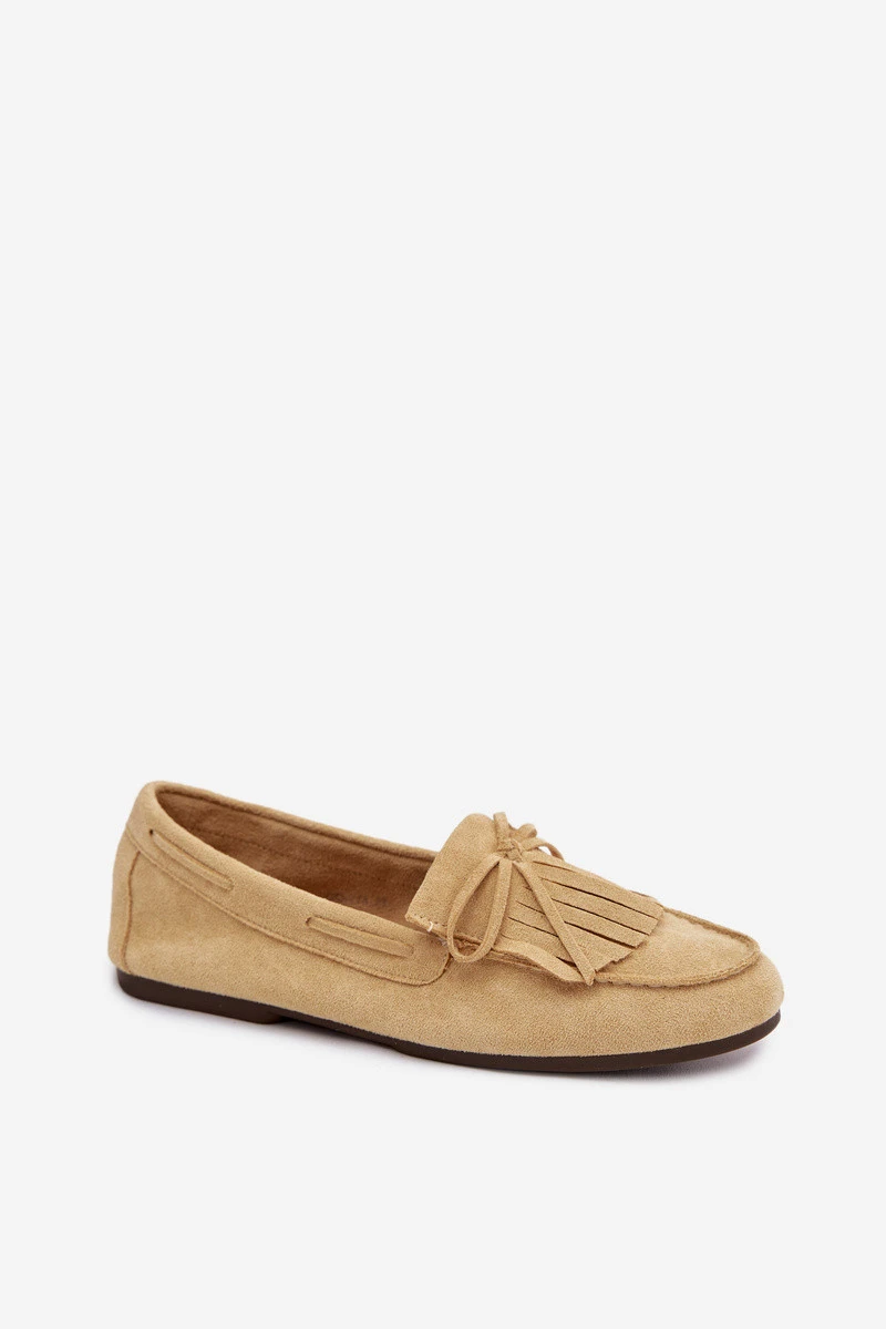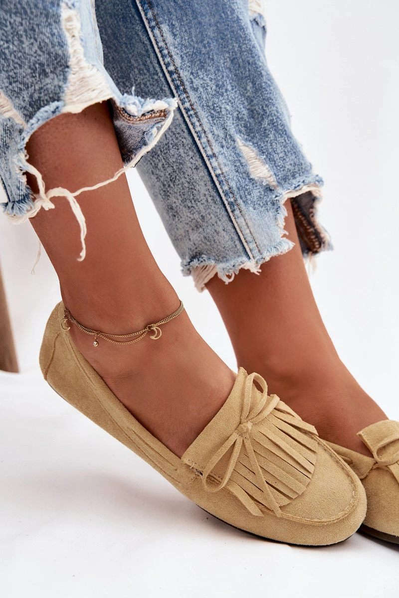 Ploché dámské mokasíny vyrobené z eko semiše jsou stylovou a pohodlnou volbou na každý den. Vepředu jsou dekorativní třásně a zavázání ve tvaru mašle. Měkký materiál zajišťuje pohodlí při nošení a plochá podrážka činí tento model ideálním pro každodenní použití. Mokasíny skvěle doplní jak klasické, tak i volnější stylizace. Při výběru velikosti se řiďte tabulkou velikostí.