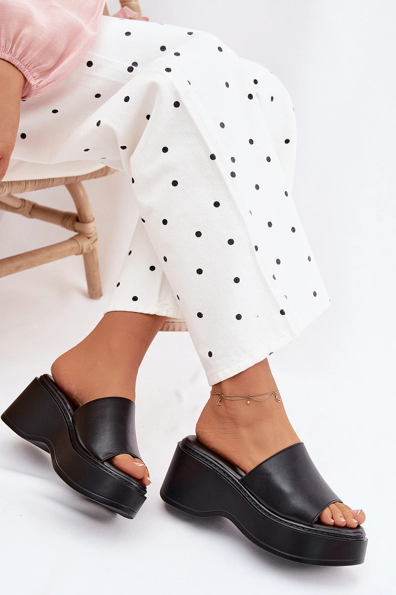 Klasické nazouváky na platformě a podpatku jsou pohodlnou a stylovou volbou, která se skvěle hodí k letním outfitem. Jejich univerzální vzhled umožňuje snadné sladění s mnoha outfity. Vyrobené z ekokůže, vypadají esteticky a moderně, a zvýšená podrážka přidává několik centimetrů na výšce, přičemž zajišťuje pohodlí při nošení. Ideální na každý den, večerní výlety a letní dovolené – všude tam, kde je důležitá volnost a styl. Při výběru velikosti se řiďte tabulkou velikostí.