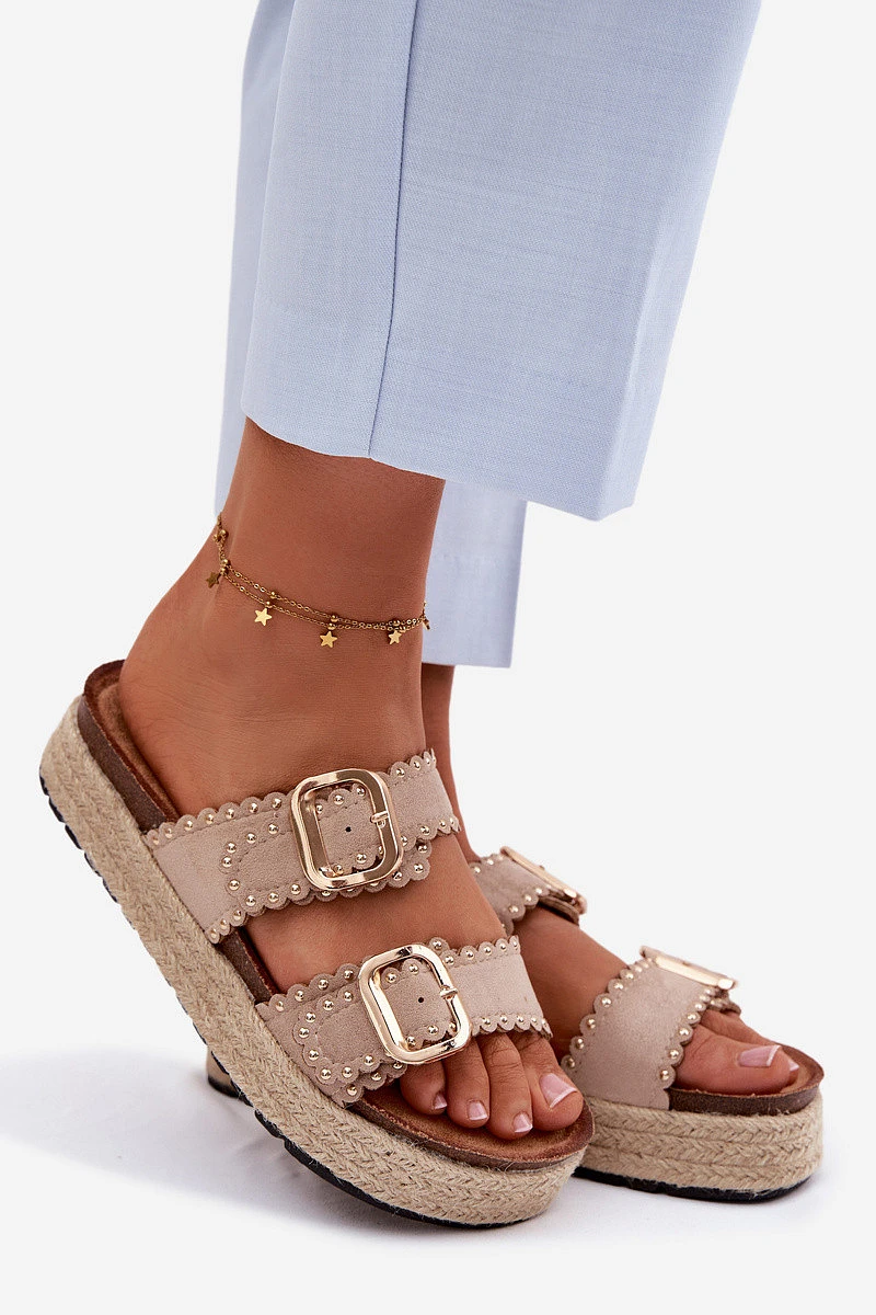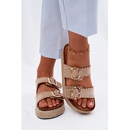 Dámské nazouváky na platformě s pletením zlaté přezky a cvočky béžové