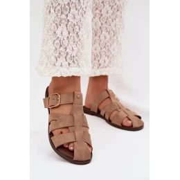 Dámské nazouváky na ploché podrážce s pásky a zlatou sponou Bežové model 22032098 - Boto