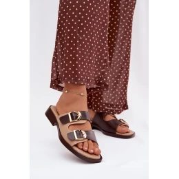 Dámské nazouváky vyrobené z eko kůže jsou klasickou volbou na každý den. Model má dva pásky se zlatými přezkami, které dodávají celku elegantní a stylový charakter. Plochá podrážka zajišťuje pohodlí při nošení a volnost při chůzi. Nazouváky se skvěle hodí do letních outfitů, vhodné jak k šatům, tak k casualovým setům. Při výběru velikosti se řiďte tabulkou velikostí.