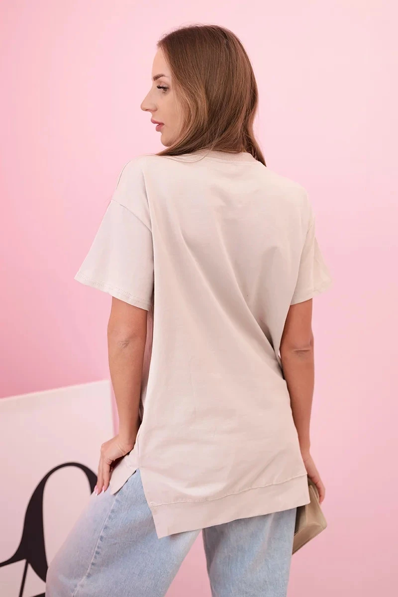 Dámské oversize bavlněné tričko srdcem a třásněmi béžové