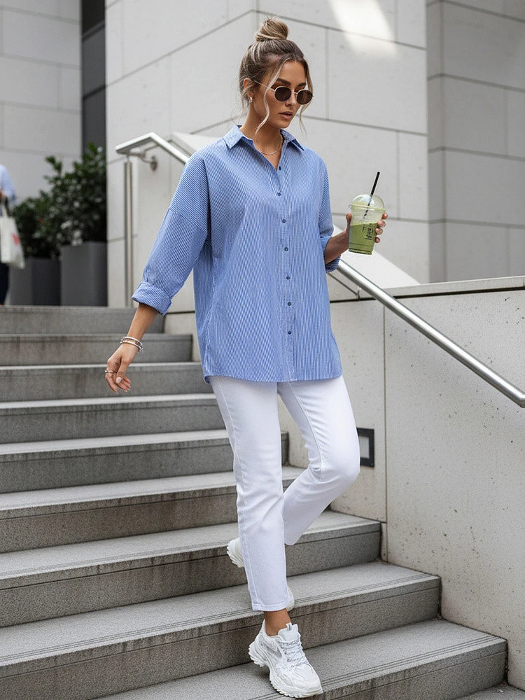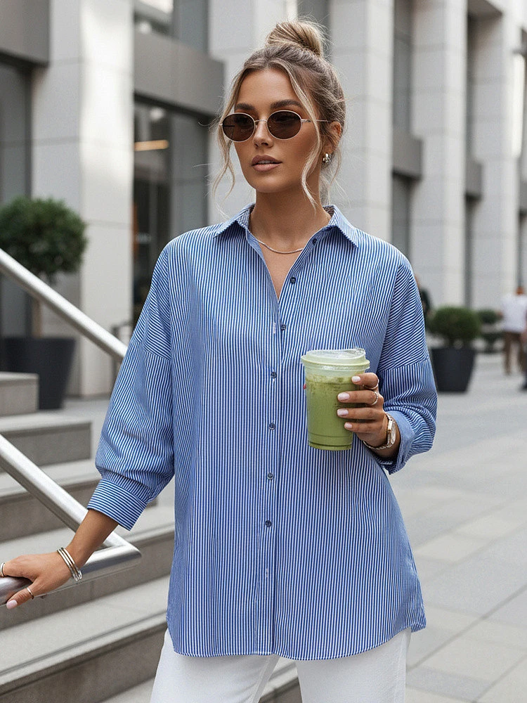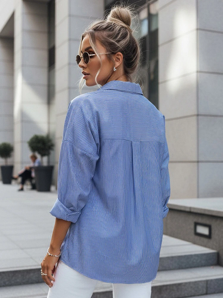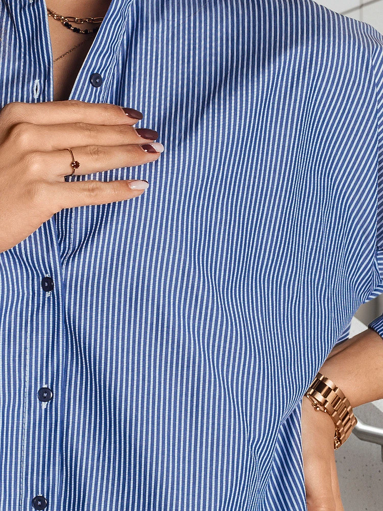 Košile nadměrné velikosti a mírně asymetrického střihu rozhodně nesmí chybět v šatníku žádné stylové ženy. BLISS je klasickým návrhem v tenkých proužcích. Má zapínání na knoflíky a manžetové rukávy. Bude vypadat bezchybně v ležérním i elegantním stylu.