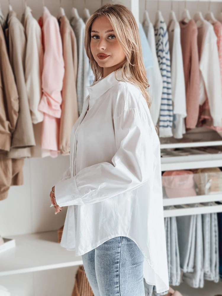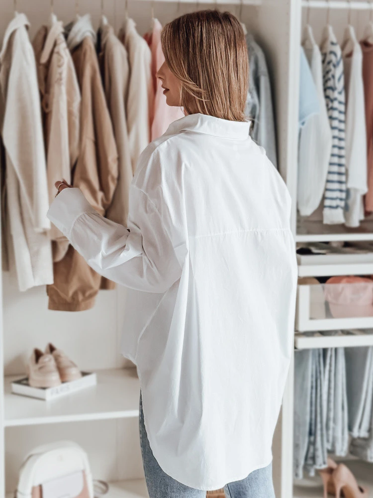 Elegantní a pohodlná dámská košile oversize s prodlouženým zadním dílem je ideální volbou pro každou příležitost. Volný střih podtrhuje styl, zatímco knoflíky umožňují přizpůsobení střihu. Rukávy jsou zakončeny klasickou manžetou na knoflíky, což působí elegantně, a skvěle se hodí ke kalhotám i sukním, aby vypadaly módně.