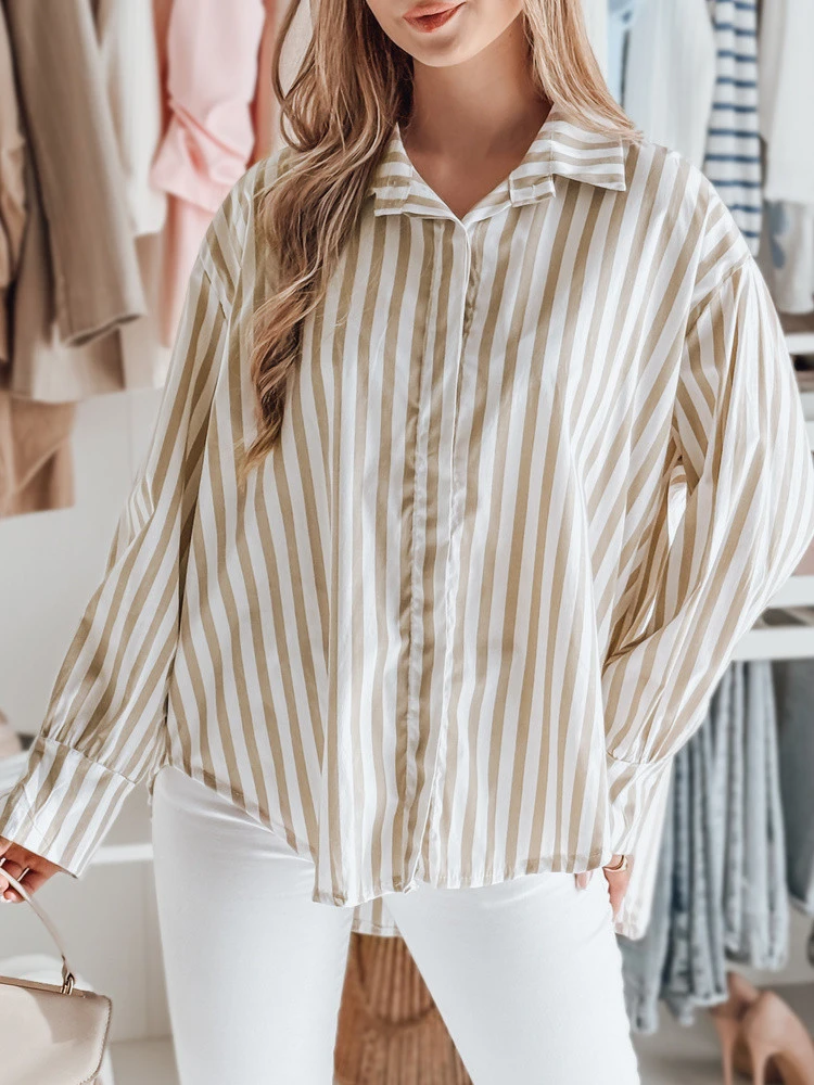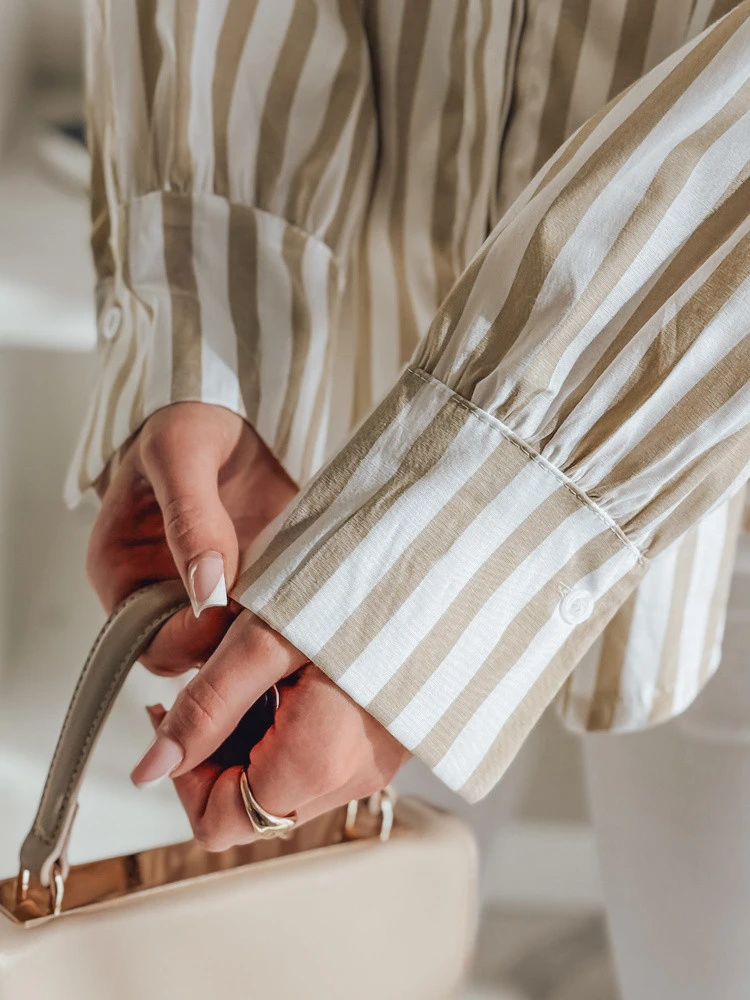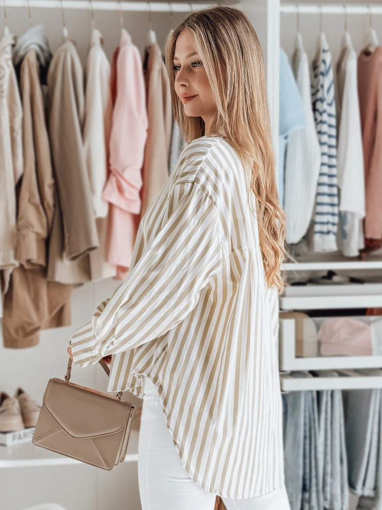 Dámská košile oversize s delšími zády, zapínáním na knoflíky, volným střihem, který dokonale sedí na těle a zajišťuje celodenní pohodlí, dlouhými rukávy s manžetami na knoflíky, které dodávají eleganci, a pruhovaným vzorem pro nadčasový vzhled, který je dokonalým základem pro mnoho outfitů.
