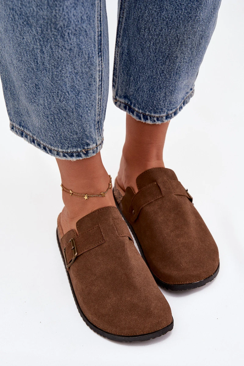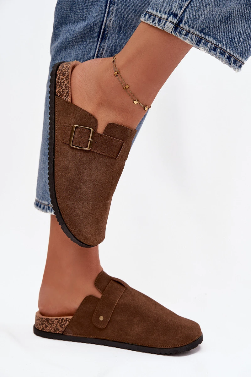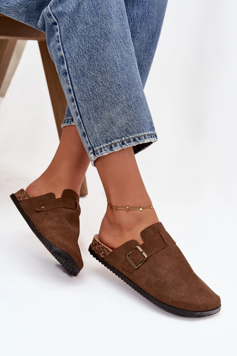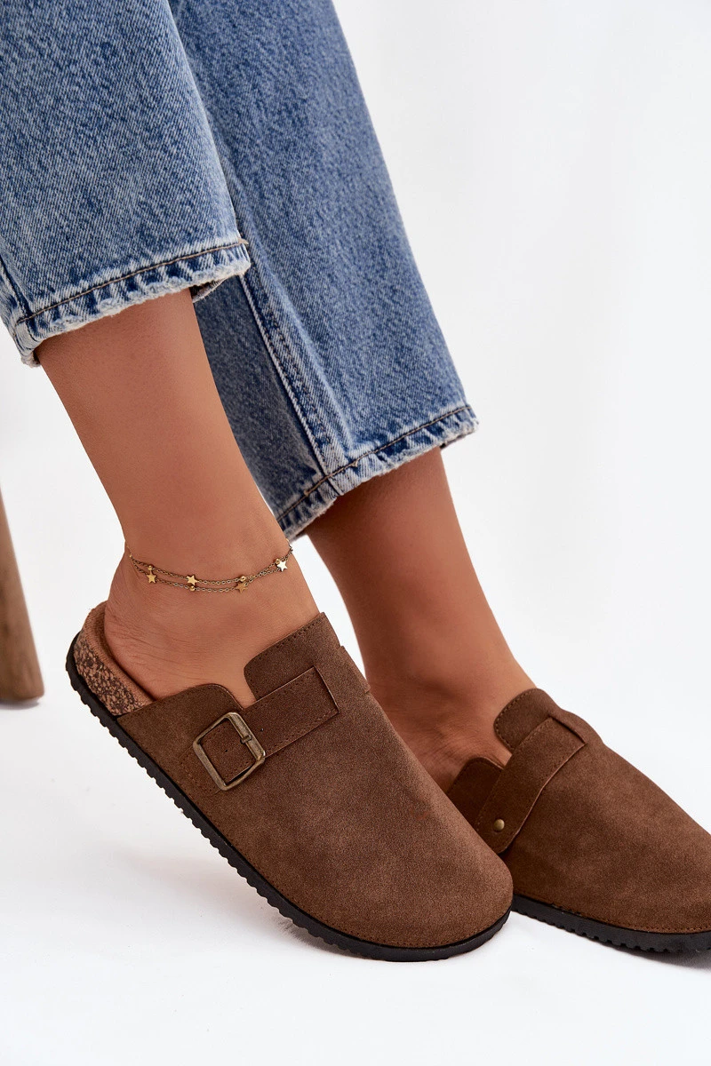 Dámské pantofle na korkové platformě. Vyrobené z eko semiše. Zakryté špičky poskytují větší ochranu a přezka umožňuje dokonalé přizpůsobení noze. Profilovaná stélka zaručuje pohodlí po celý den a poskytuje správnou oporu. Tyto pantofle budou vynikající volbou na každodenní nošení, ideální pro casual stylizace, poskytující pohodlí a módní vzhled. Při výběru velikosti se řiďte tabulkou velikostí.