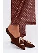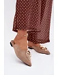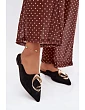 Dámské nazouváky typu mule vyrobené z eko semiše jsou stylovou volbou s elegantním charakterem. Uzavřená, špičatá špička dodává modelu klasickou formu a velký zlatý detail vpředu tvoří výrazný akcent přitahující pozornost. Plochý podpatek zajišťuje pohodlí při nošení. Tento model skvěle doplní jak elegantní, tak casualové outfity. Při výběru velikosti se řiďte tabulkou velikostí.