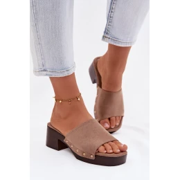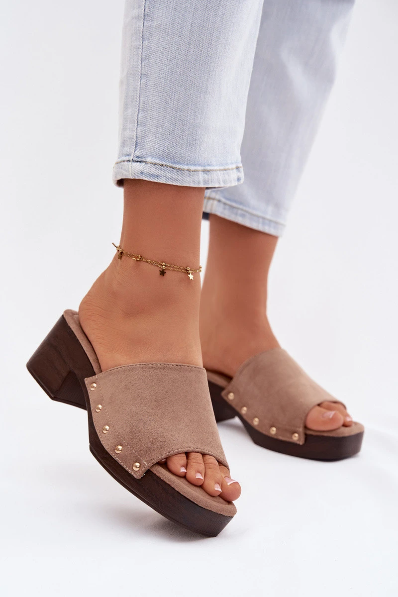 Dámské nazouváky vyrobené z ekologické semišové kůže jsou stylovým tipem pro ženy, které mají rády módní akcenty. Model na stabilním klockovém podpatku a platformě zaručuje pohodlí a jistotu kroku. Měkká vložka se stará o komfort nošení a zlaté nýty po stranách dodávají celku výrazný charakter. Tyto nazouváky se skvěle hodí jak do každodenních, tak i do elegantnějších letních outfitů. Při výběru velikosti se řiďte tabulkou velikostí.
