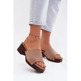 Dámské nazouváky vyrobené z ekologické semišové kůže jsou stylovým tipem pro ženy, které mají rády módní akcenty. Model na stabilním klockovém podpatku a platformě zaručuje pohodlí a jistotu kroku. Měkká vložka se stará o komfort nošení a zlaté nýty po stranách dodávají celku výrazný charakter. Tyto nazouváky se skvěle hodí jak do každodenních, tak i do elegantnějších letních outfitů. Při výběru velikosti se řiďte tabulkou velikostí.