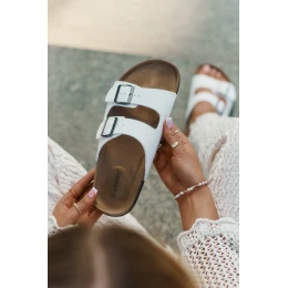 Dámské pantofle vyrobené z ekologické kůže. Dvě pásky s přezkami zajišťují snadné přizpůsobení noze a korková podrážka dodává lehkost a módní charakter. Profilovaná stélka zaručuje pohodlí po celý den, což dělá tyto pantofle ideální volbou na procházky nebo letní výlety. Komfort a styl v jednom! Při výběru velikosti se řiďte tabulkou velikostí.