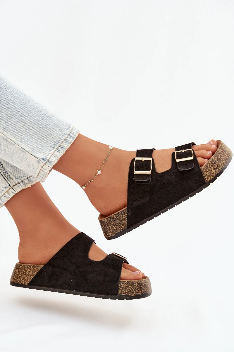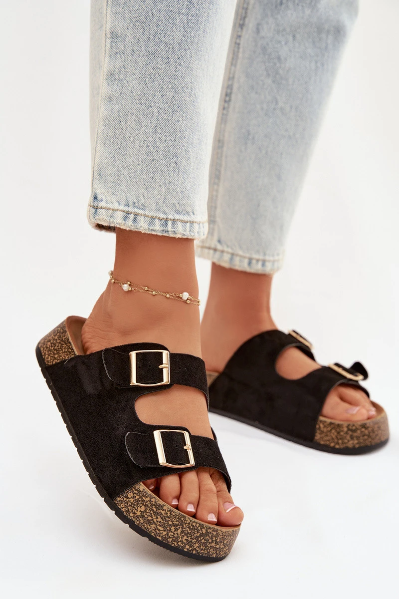 Dámské pantofle na korkové platformě jsou módní a pohodlnou volbou na teplé dny. Vyrobené z eko semiše, vypadají stylově a příjemně se přizpůsobují noze. Dva pásky se zlatými přezkami dodávají celku elegantní charakter a zdůrazňují aktuální trendy. Model se skvěle hodí do letních stylizací, spojující pohodlí s módním vzhledem. Při výběru velikosti se řiďte tabulkou velikostí.