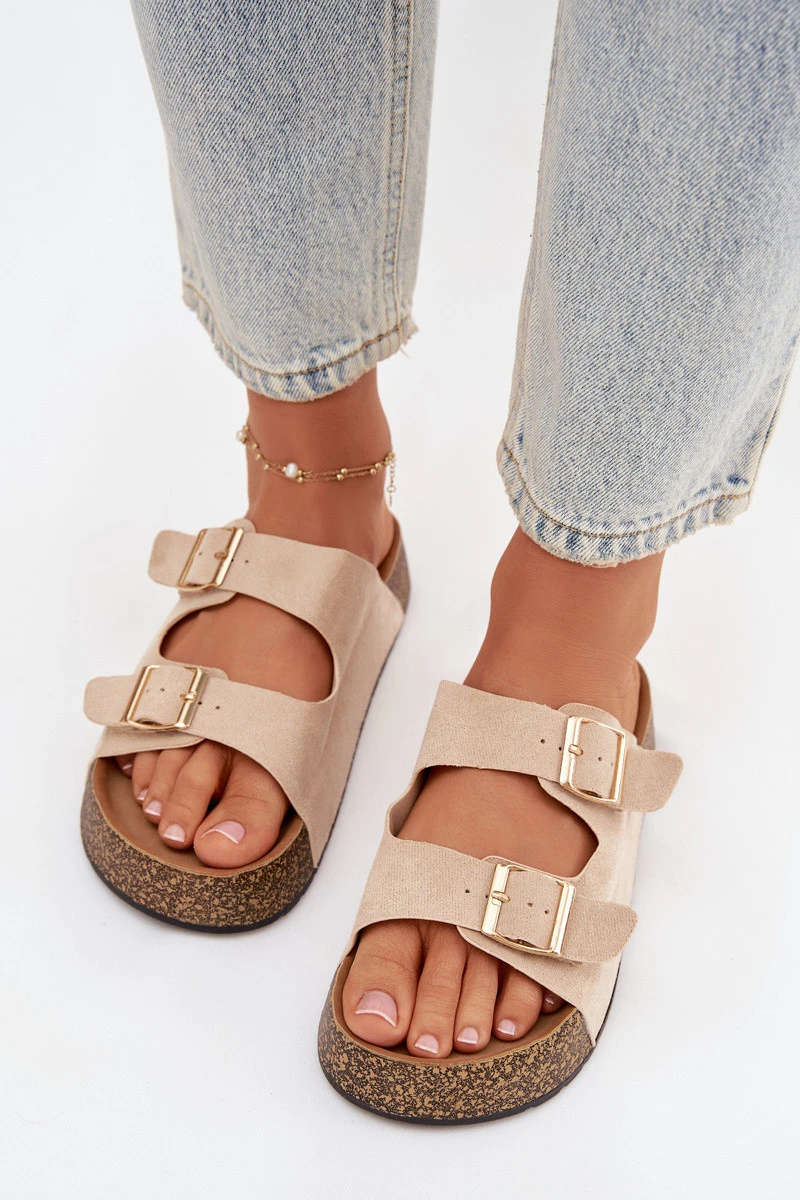 Dámské pantofle na korkové platformě se zlatými sponami světle béžové model 21919272 - EVENTO