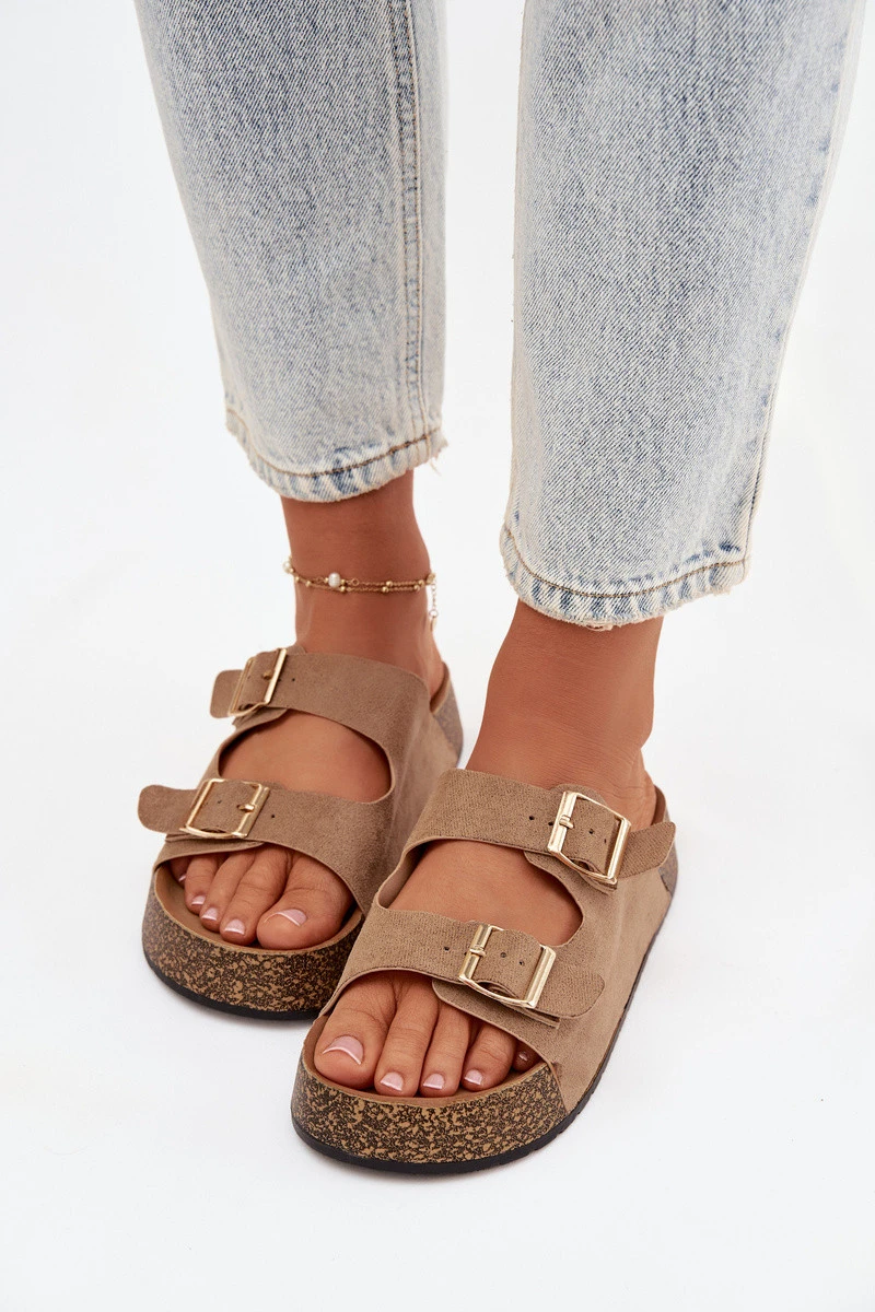 Dámské pantofle na korkové platformě se zlatými sponami tmavě béžové model 21919279 - EVENTO