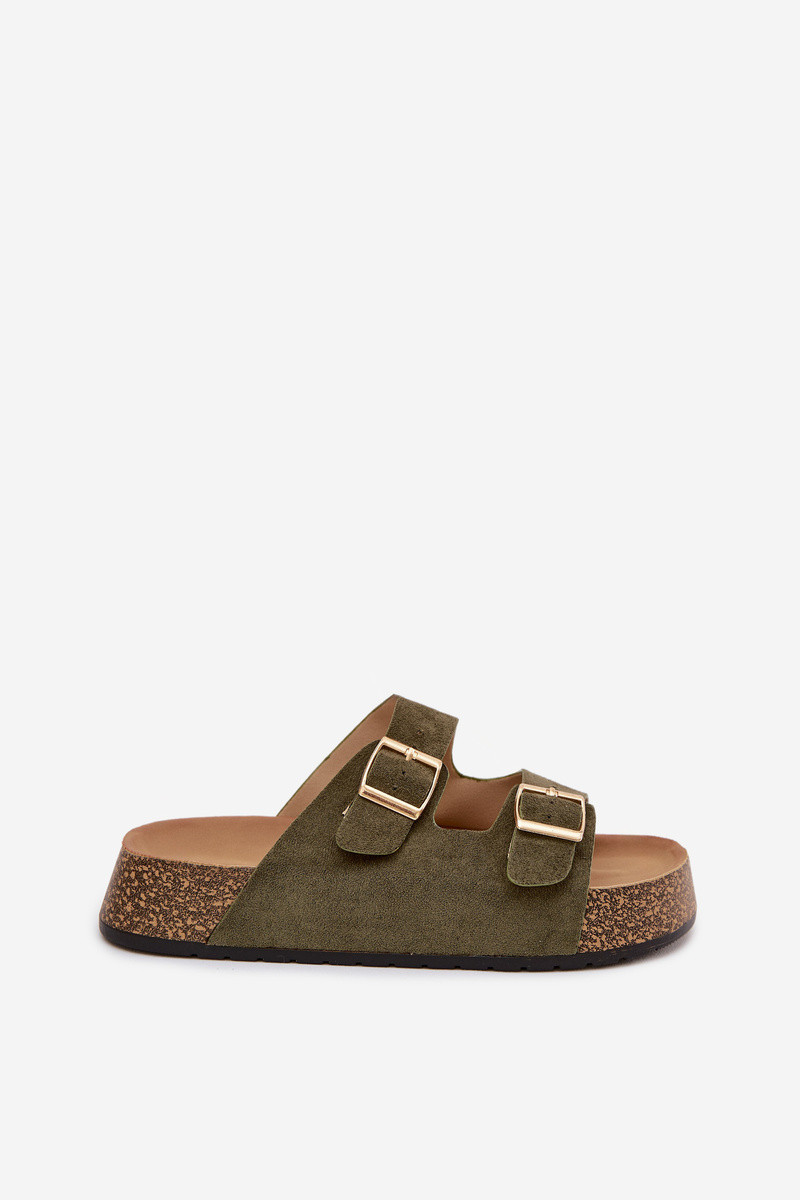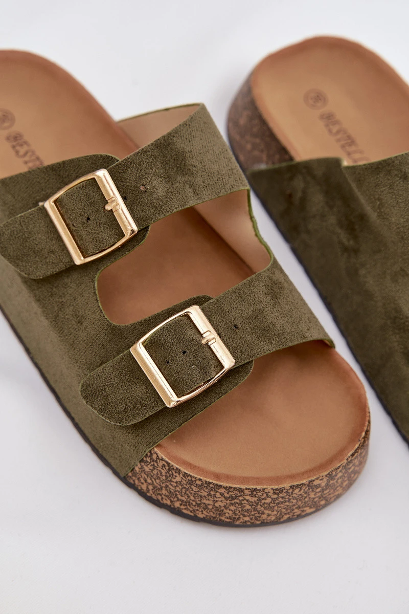 Dámské pantofle na korkové platformě jsou módní a pohodlnou volbou na teplé dny. Vyrobené z eko semiše, vypadají stylově a příjemně se přizpůsobují noze. Dva pásky se zlatými přezkami dodávají celku elegantní charakter a zdůrazňují aktuální trendy. Model se skvěle hodí do letních stylizací, spojující pohodlí s módním vzhledem. Při výběru velikosti se řiďte tabulkou velikostí.
